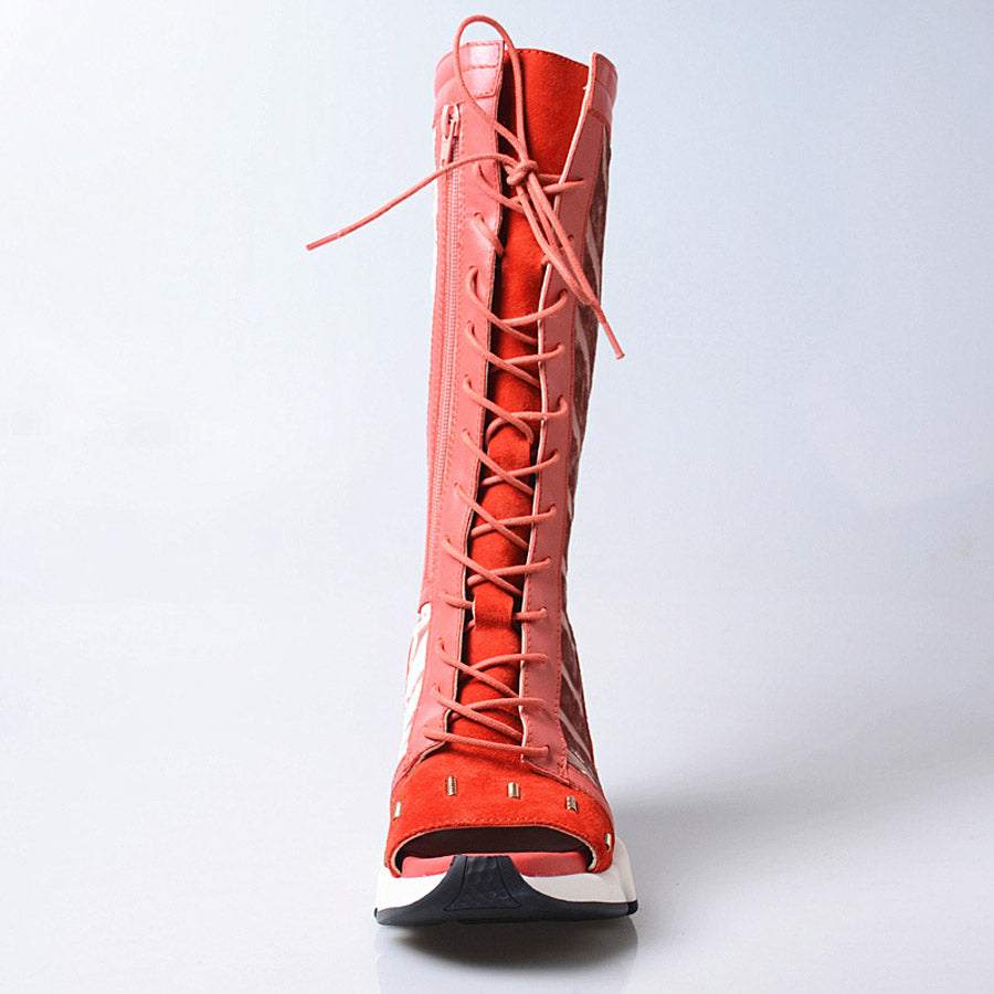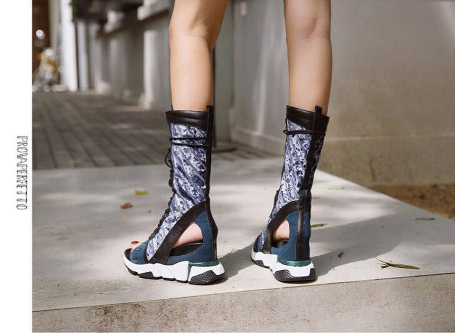 Lady genuine leather patchwork wedge heel sandals