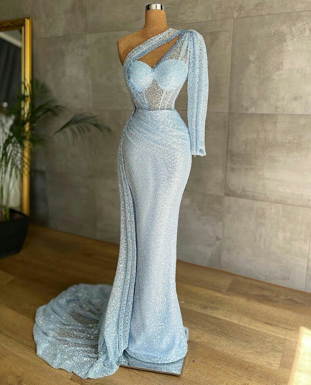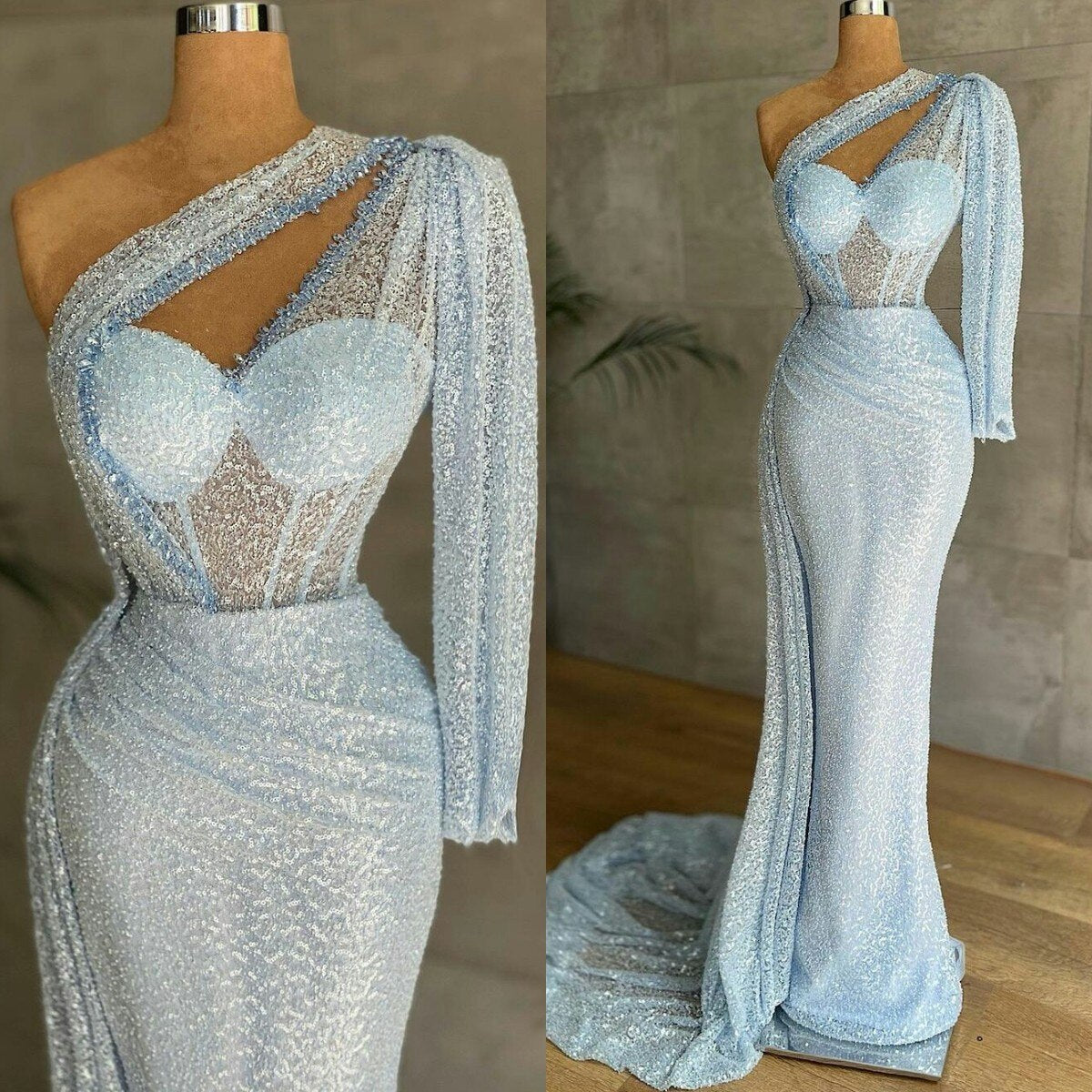 Light Blue One Shoulder Evening Dresses Mermaid Dress