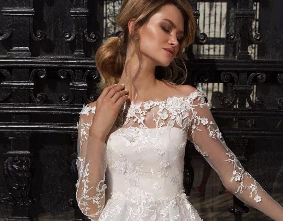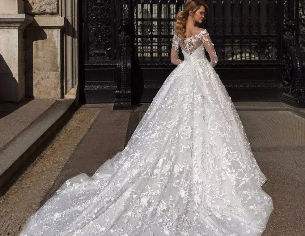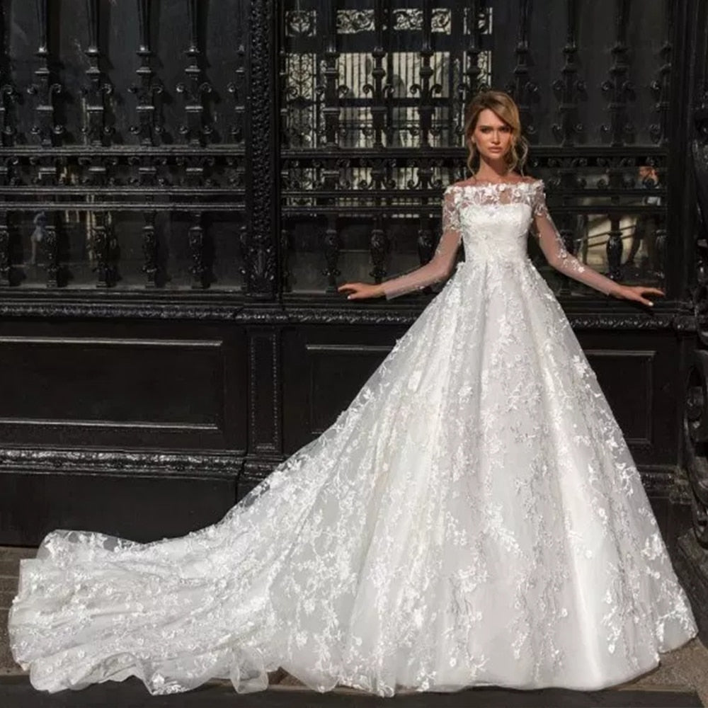 Long Sleeve Flowers Lace Wedding Gowns A-line Vestido De Noiva Princesa Boat Neck Buttons Up Luxury Bridal Dress Casamento