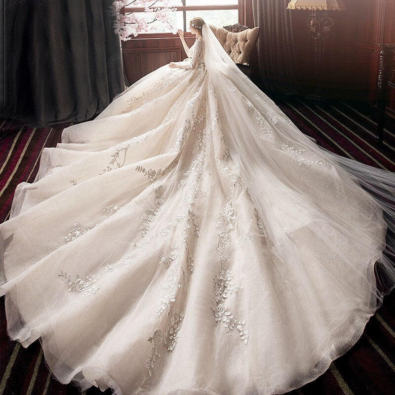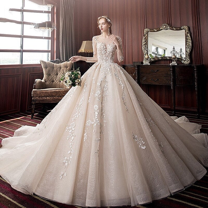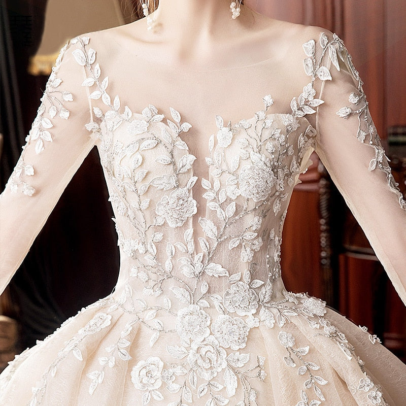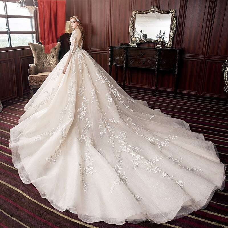 Long Sleeve Wedding Dress New Backless Luxury Hand Made Beading Pearls Lace Appliques Champagne Flash Princess Bridal Ball Gowns