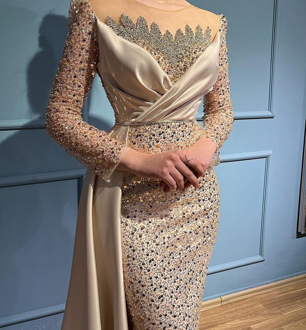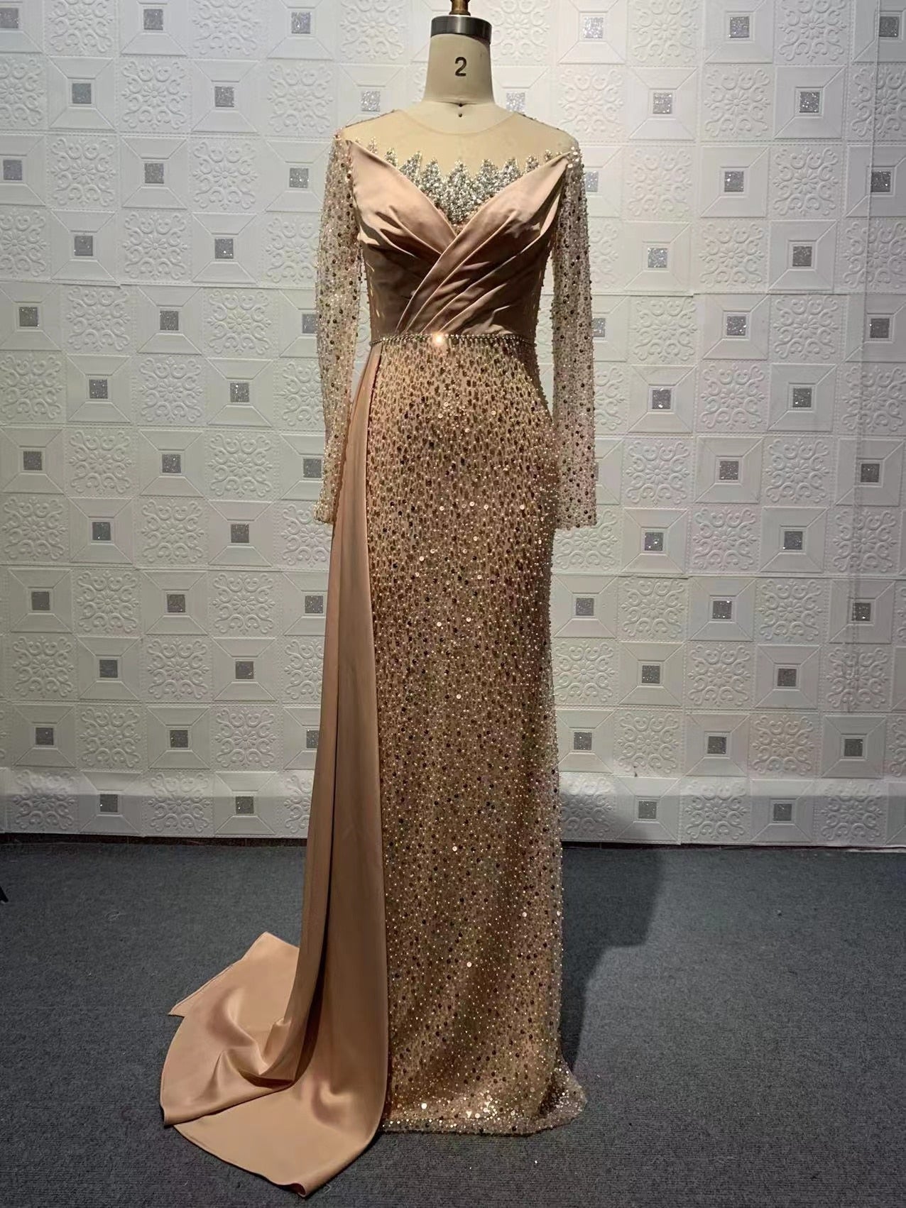 Long Sleeve Women Mermaid Satin Formal Evening Party Gowns