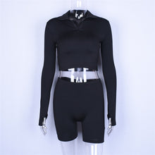 long sleeve zipper high neck elastic sexy crop tops shorts 2-pieces