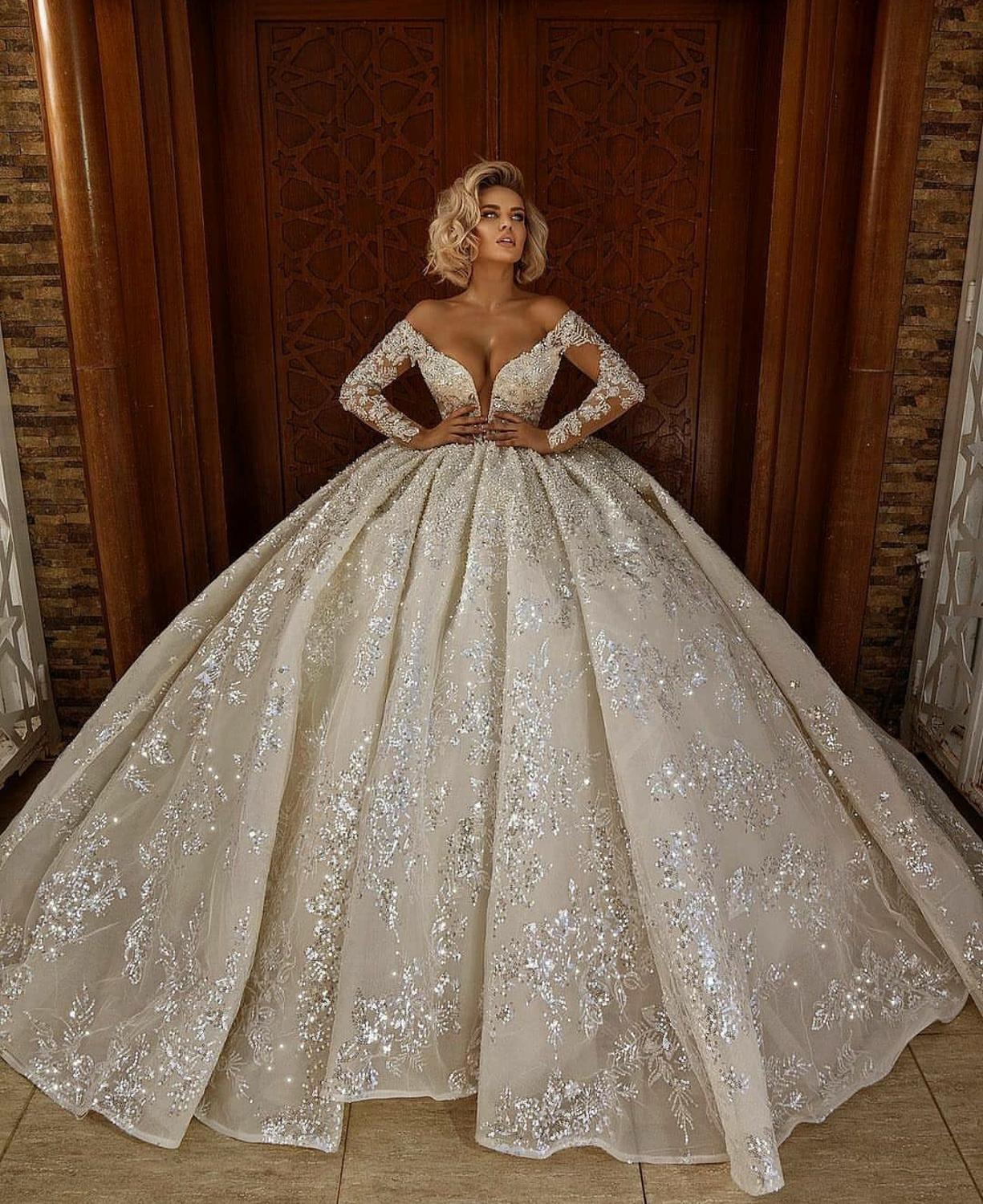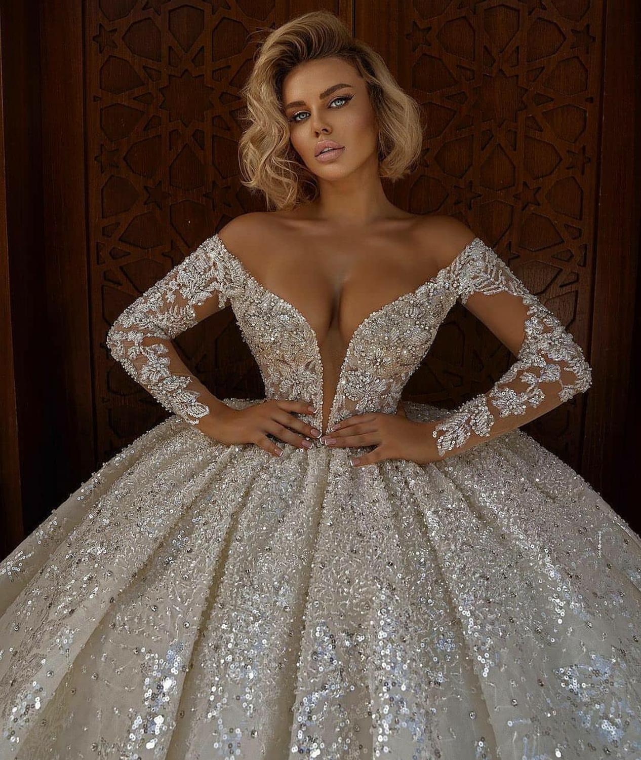 Long Sleeves Deep V Neck Bridal Plus Size Wedding Gowns