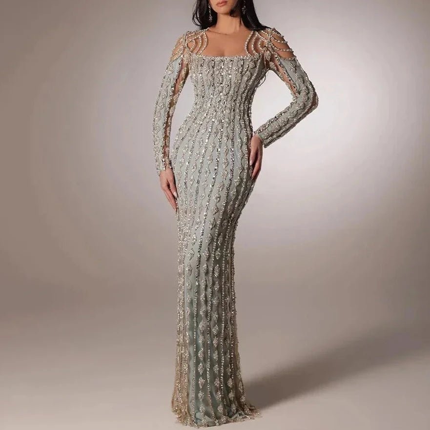 Turn heads in our 2024 Luxury Gray Mermaid Gown. This floor-length dress, defined by its exquisite beaded cut outs, is perfect for women making their mark at weddings or parties. The intricate beadwork beautifully complements the elegant cut outs, accentuating the dress's flair. The mermaid design flows all the way down to the floor, amplifying its drama. Embrace this unique mix of sophistication and charm.