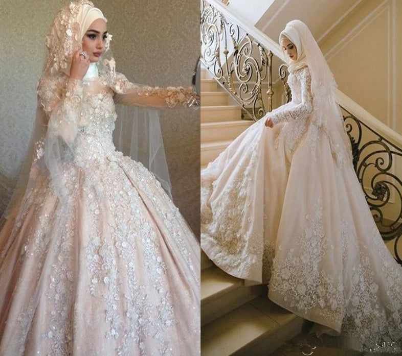 Luxury Muslim Arabic Wedding Dresses Long Sleeve Full Lace 3D Floral Beaded Hijab Dubai Princess Bride Wedding Dress