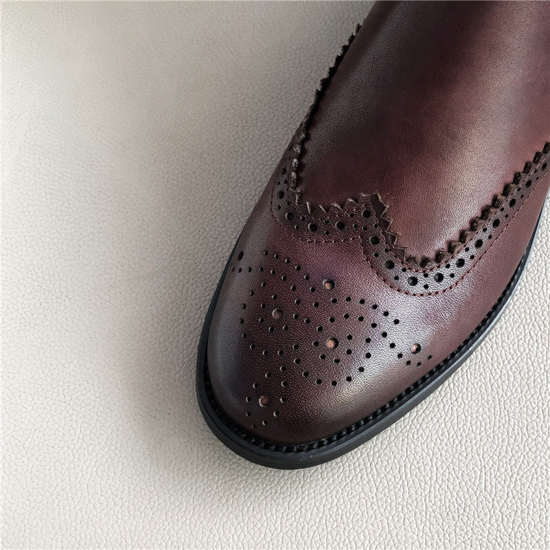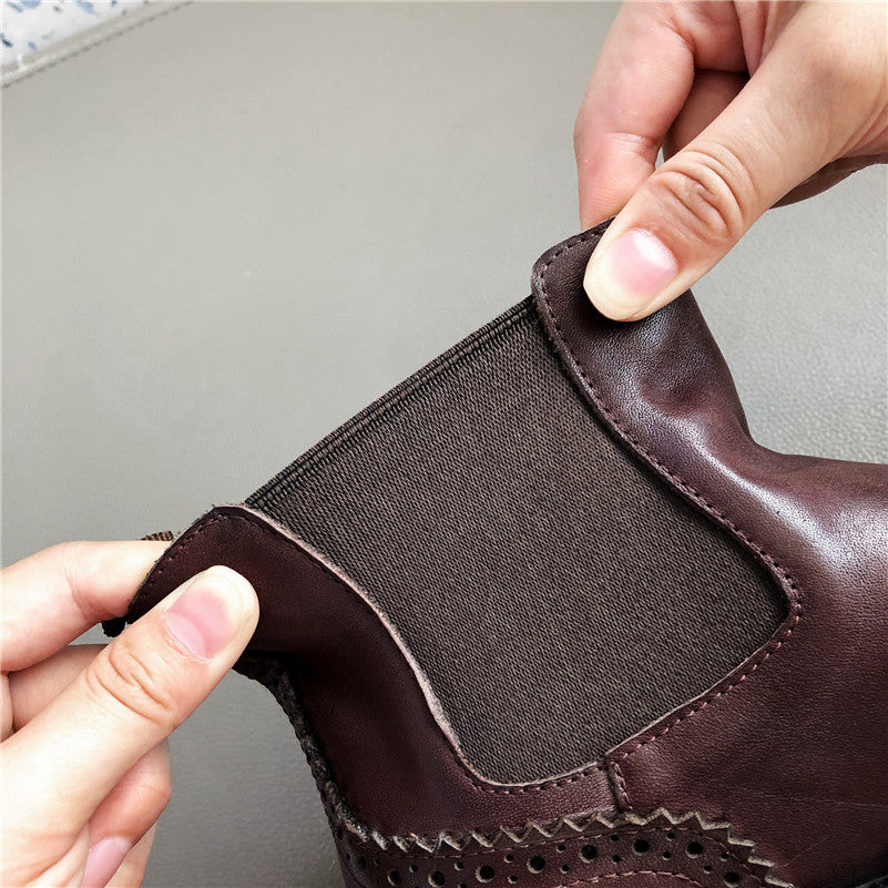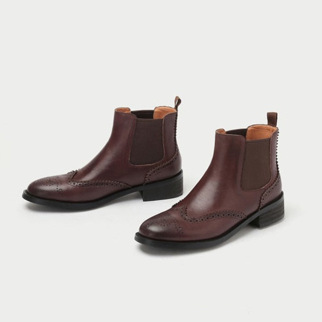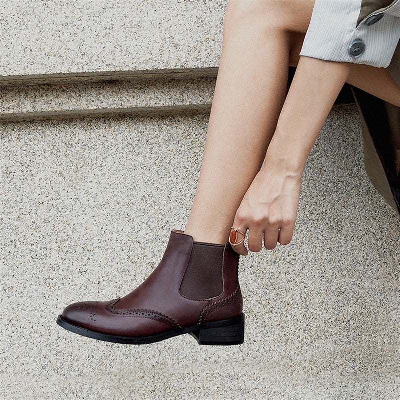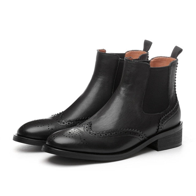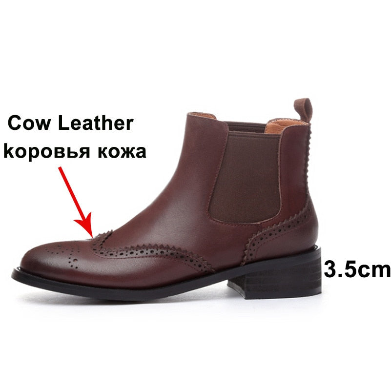 Chelsea Boots Women Natural Genuine Leather Thick Heels Ankle Boots Winter Autumn Round Toe Brogue Shoes Ladies Size 42