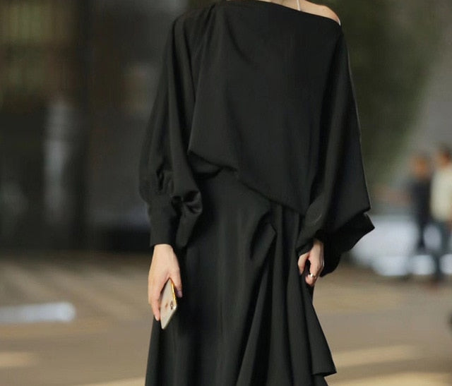 Fashion Designer Suit Spring Summer Women Lantern Sleeve Loose Tops+ Asymmetrical skirt Two-piece set