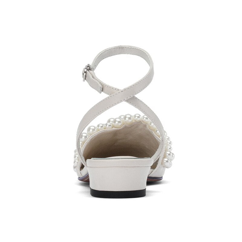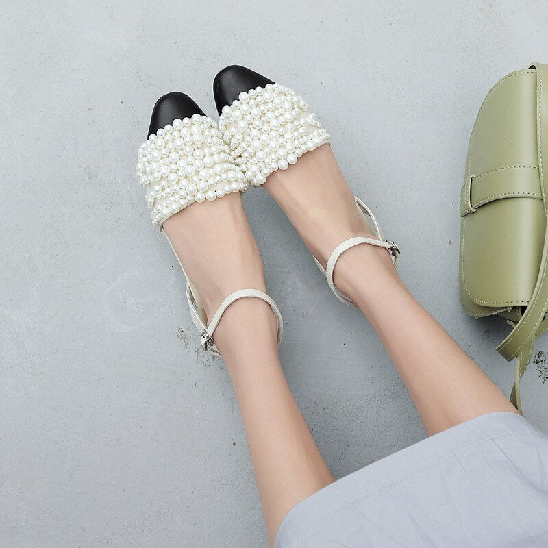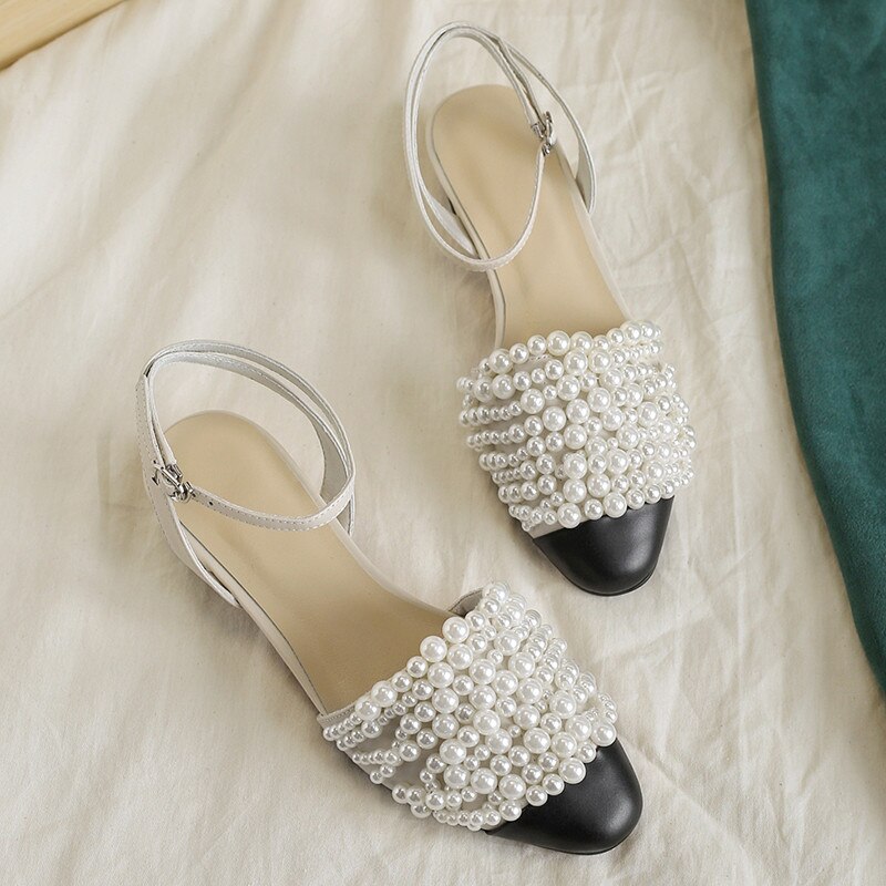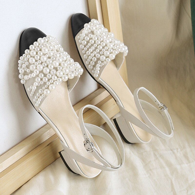 new arrival genuine leather women sandals round toe pearl summer shoes buckle sweet high quality party shoes