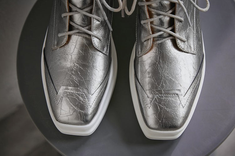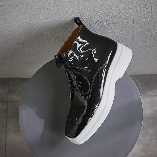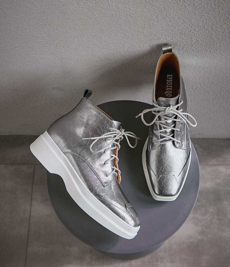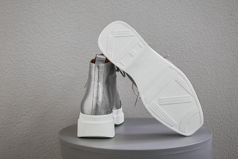 Muffin Shoes Silver Casual Elevator Women Ankle Boots Medium Heel Platform Booties Patent Leather Square Toe Flatform Wedge