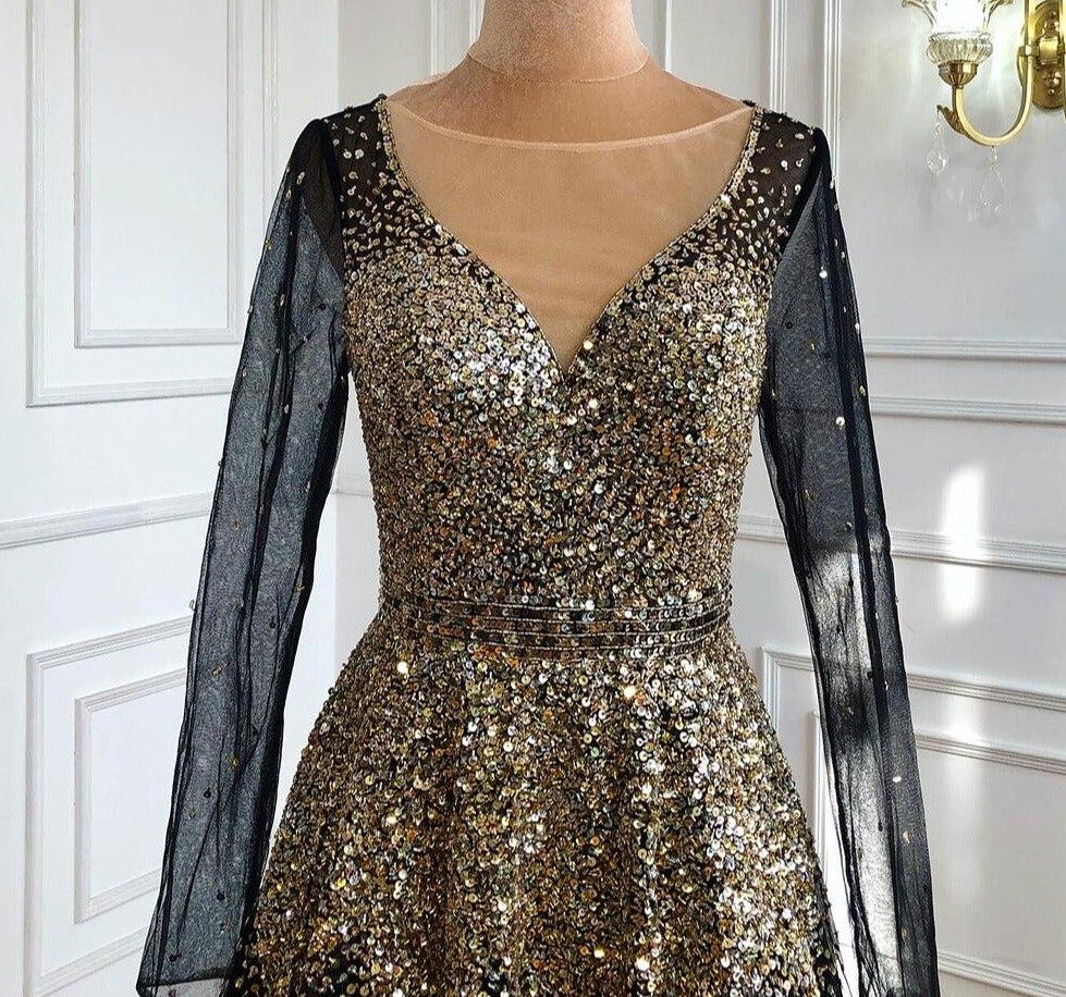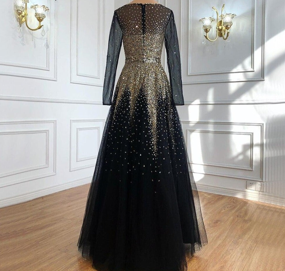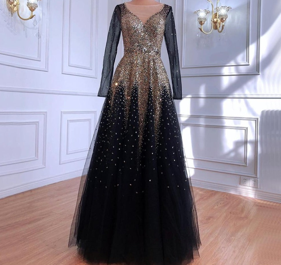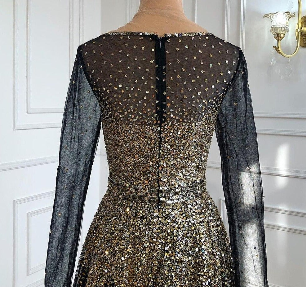 Muslim Black Gold Luxury Evening Dresses Gowns A-Line Sparkle Beading For Women Party