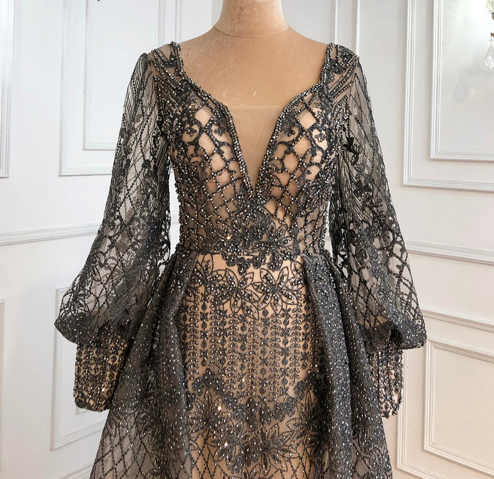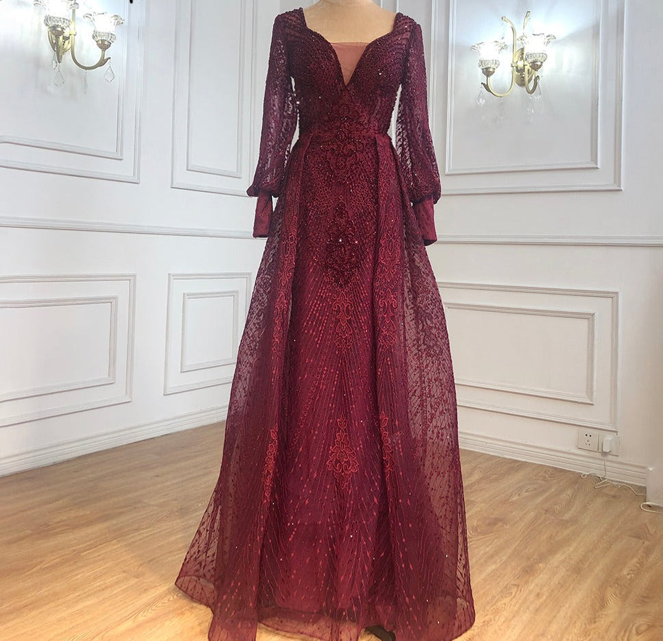 Muslim Luxury Blue Evening Dresses Gowns 2022 Long Sleeves Beaded Mermaid With Overskirt For Woman Party