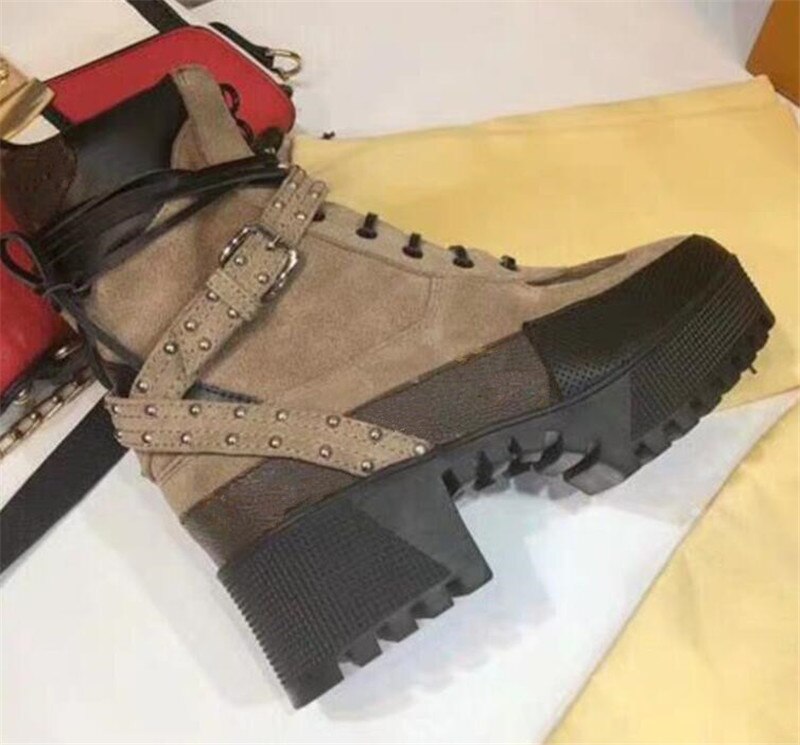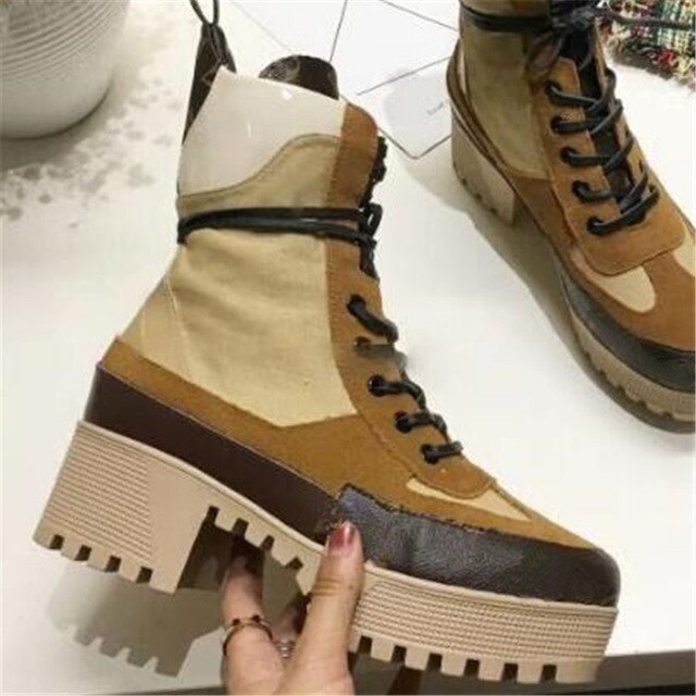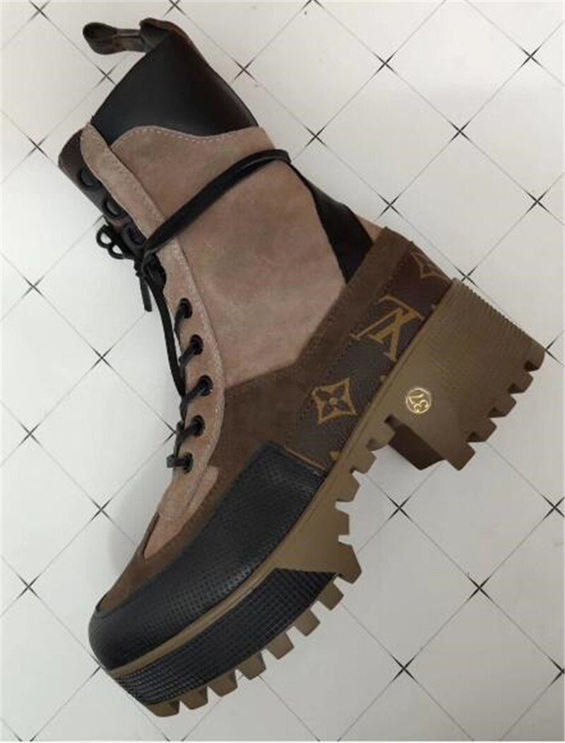 New Ankle Boots Genuine Leather Round Toe Thick Heel Floral Printed Platform Short Boots Autumn Winter Boots Lace Up Shoes Women