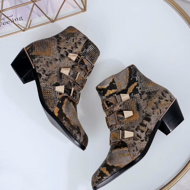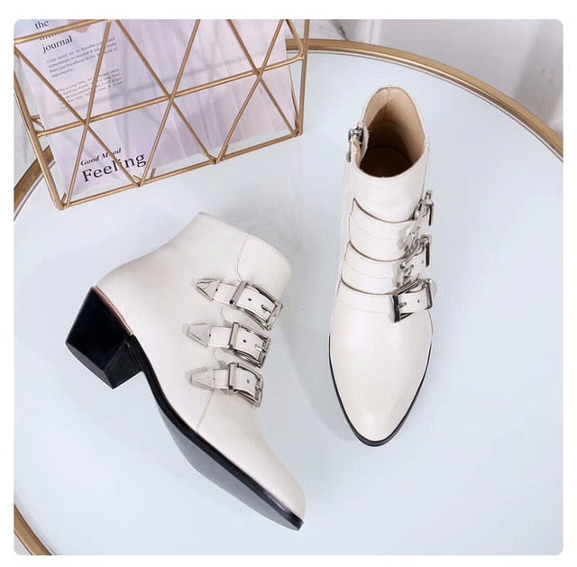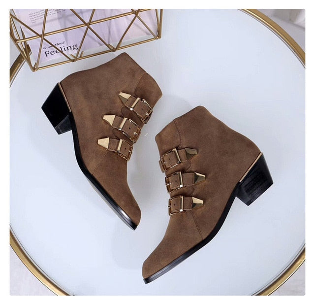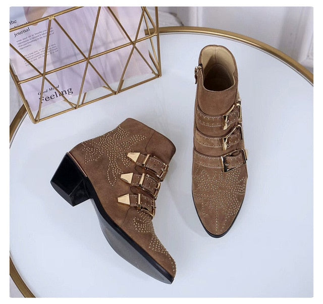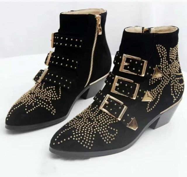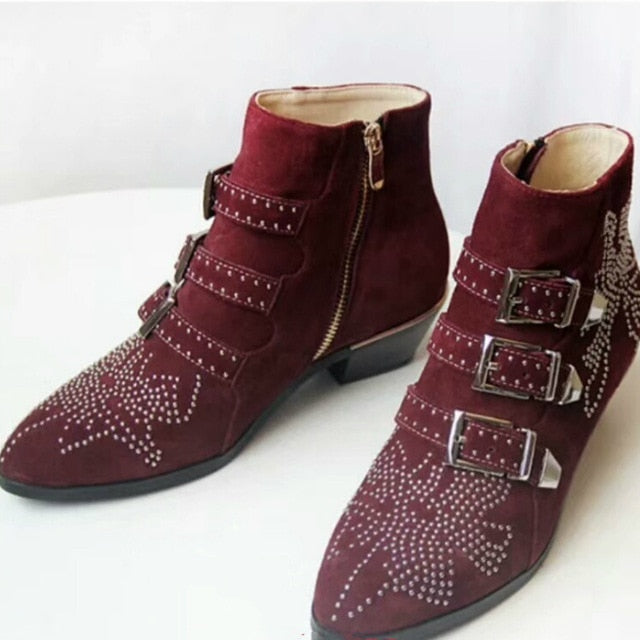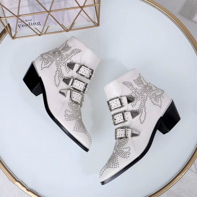 New Ankle Boots Women Round Toe Rivet Flower Boots Susanna Studded Genuine Leather Luxury Brand Velvet Boots Zapatos Mujer