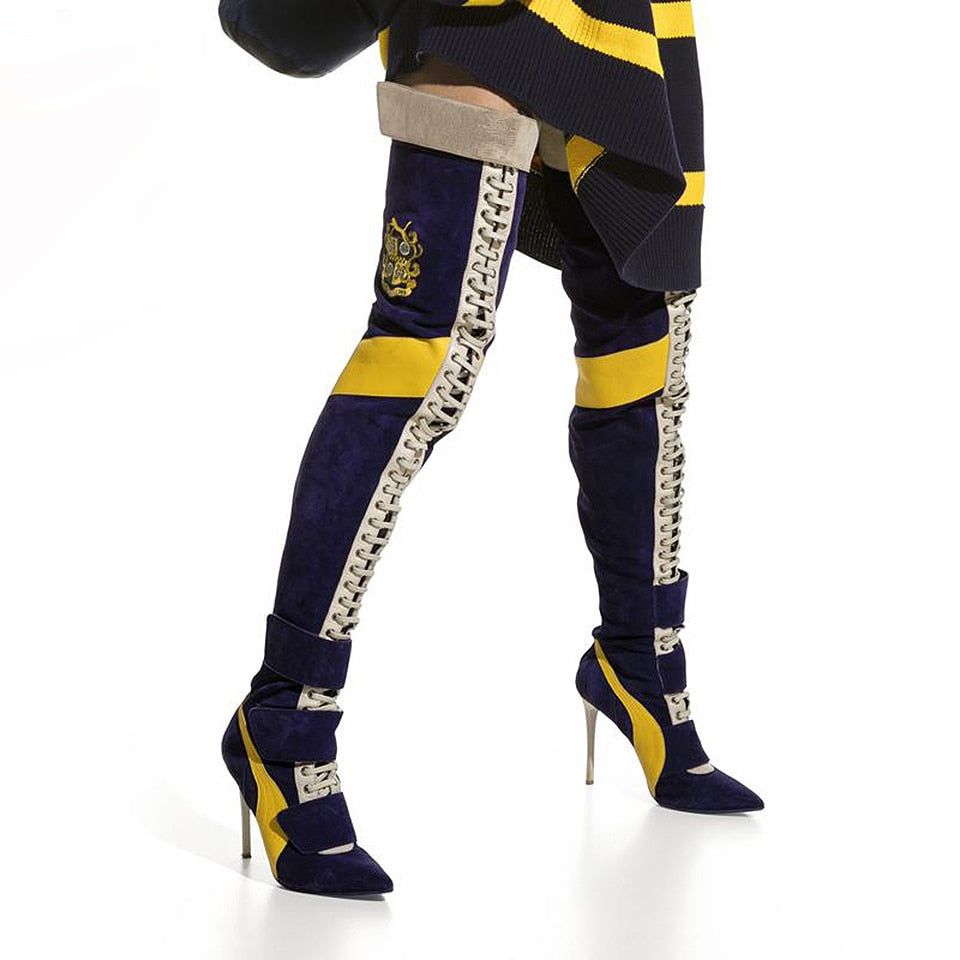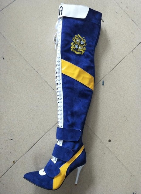 New Arrival Blue Patchwork Thigh high boots Women pointy toe High heels Lace up botas largas Sexy Over the knee knight boots