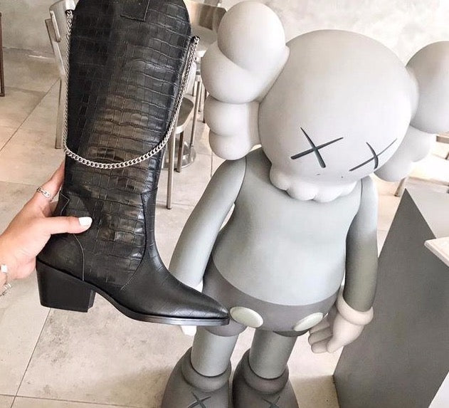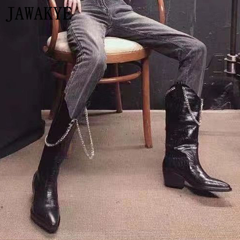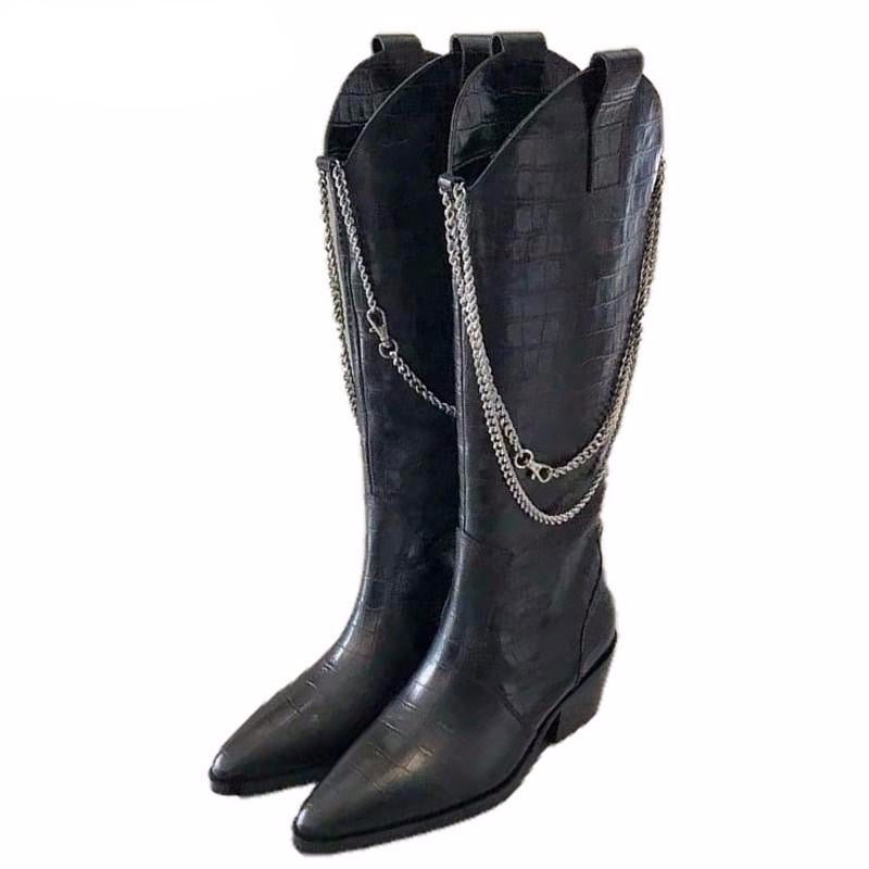 New Metal chain Tassel Black Knee high boots women crocodile leather Square chunky heel Knight boots Sexy Cowboy boots Femme