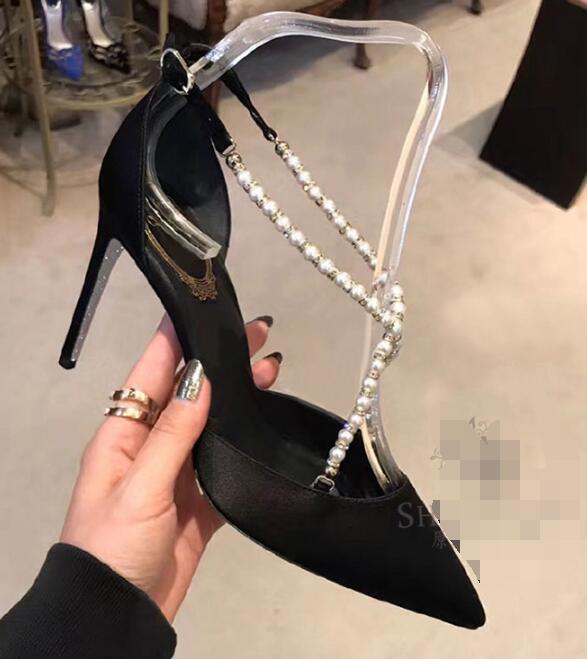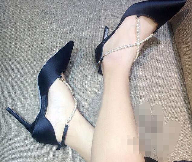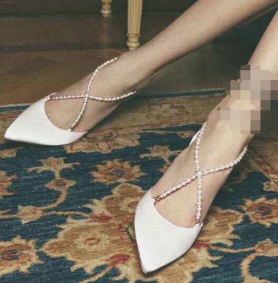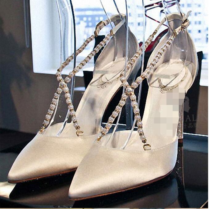 New rhinestone pearls cross strap woman wedding shoes pointed toe high heel satin woman pearls dress shoes wedding shoes white