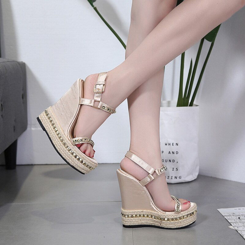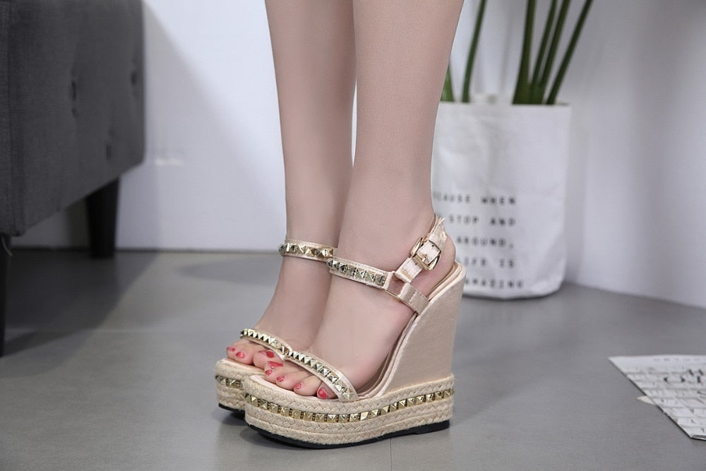 Gold Ladies Sandals Platform Sandals Women Shoes Summer High Heels Shoes Ankle Strap Chaussures Femme Rivet Wedges Shoes