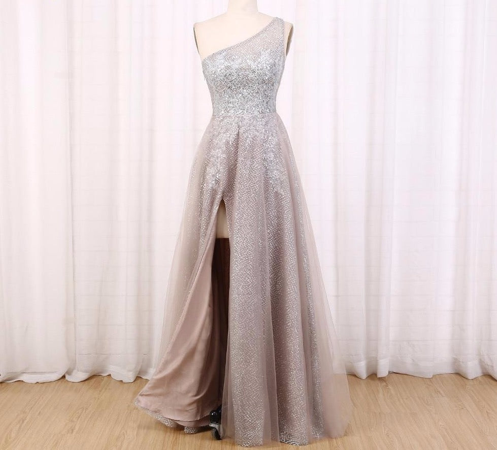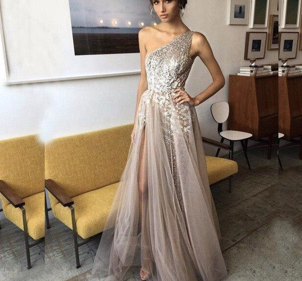 One Shoulder Sequin Evening Dress Long Prom Dress Shiny Sexy vestidos de fiesta Appliques Glitter Slight
