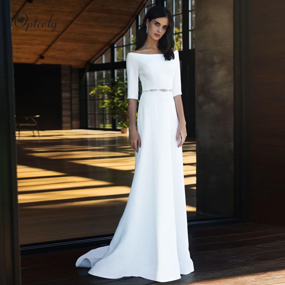 Simple Boat Neck White A-Line Wedding Dress High Quality Beaded Half Sleeves Princess Dream Gown Vestido de Noiva