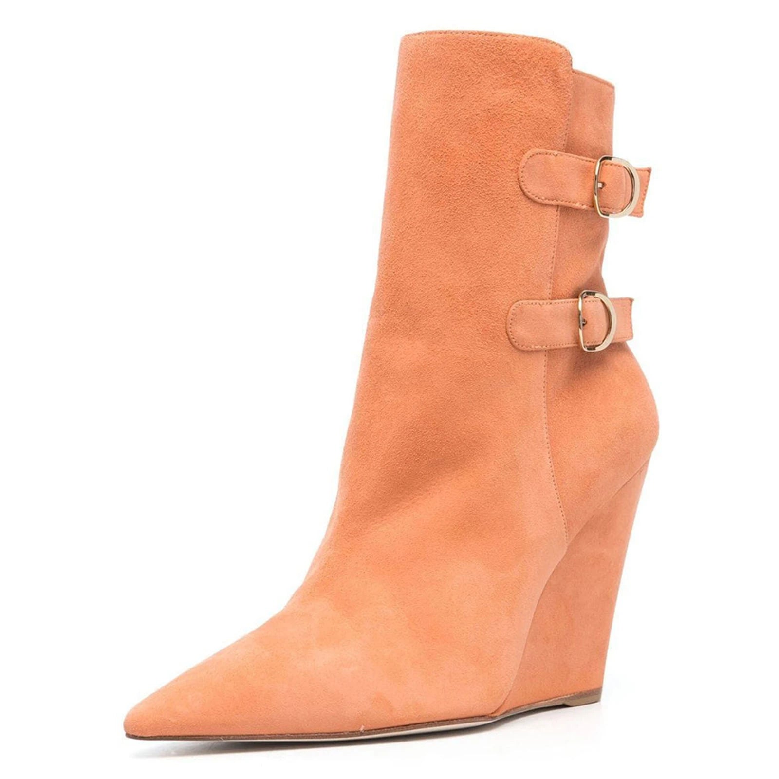 Orange suede Wedges Short boots Pointed toe Side zipper High-heeled Belt buckle Modern boots Extra large size