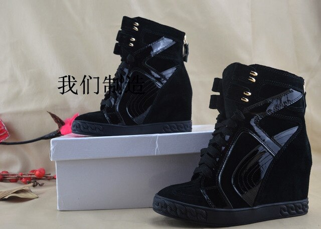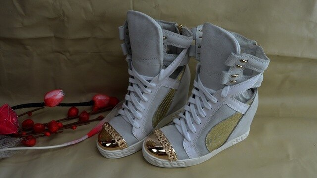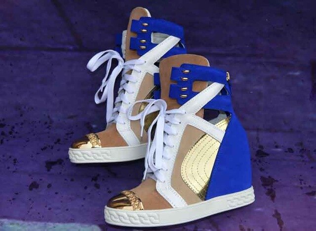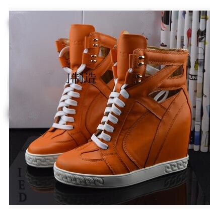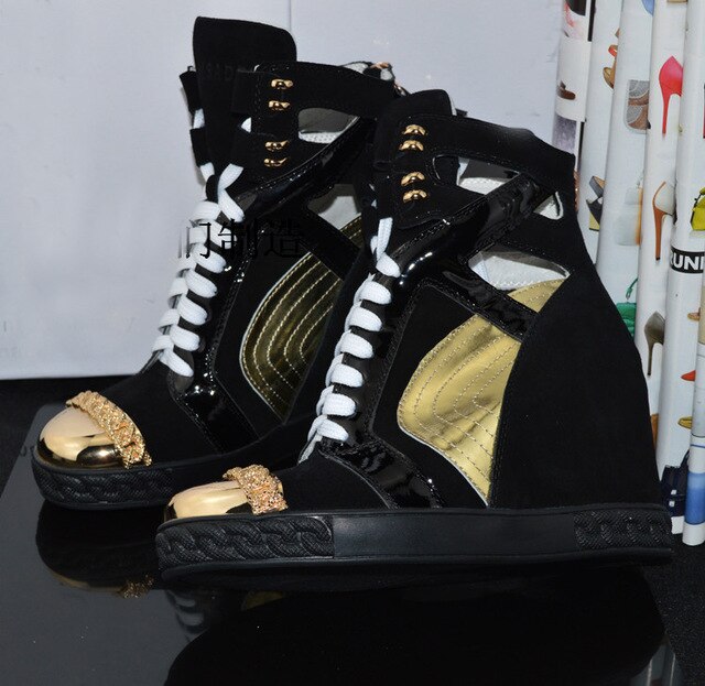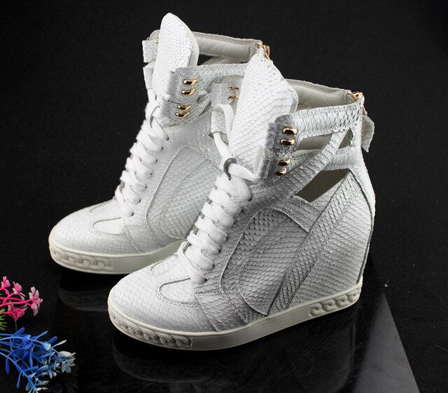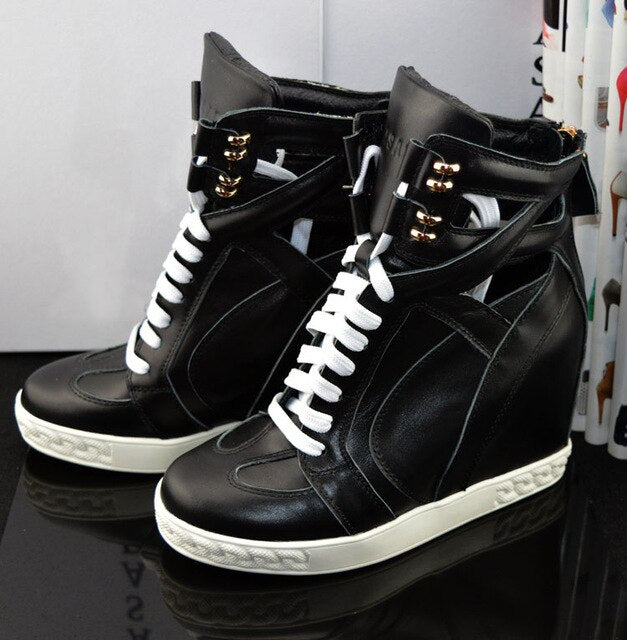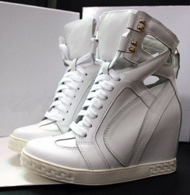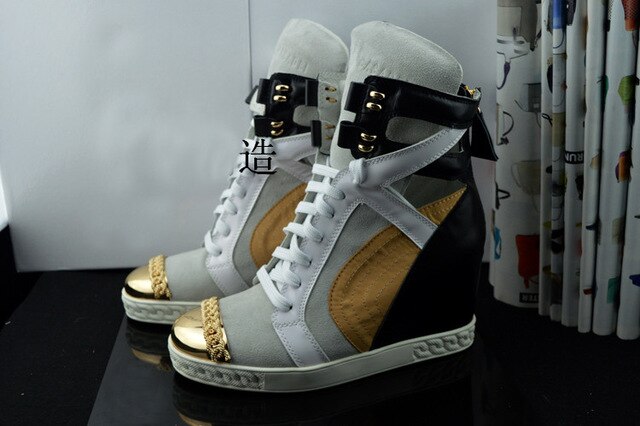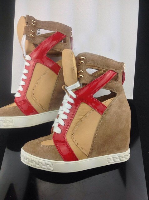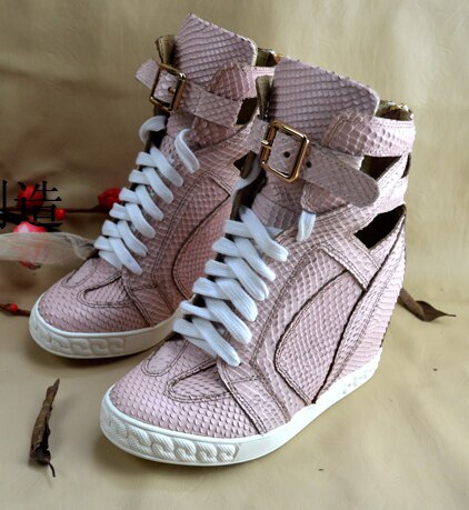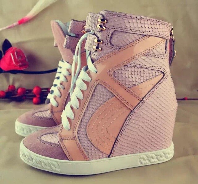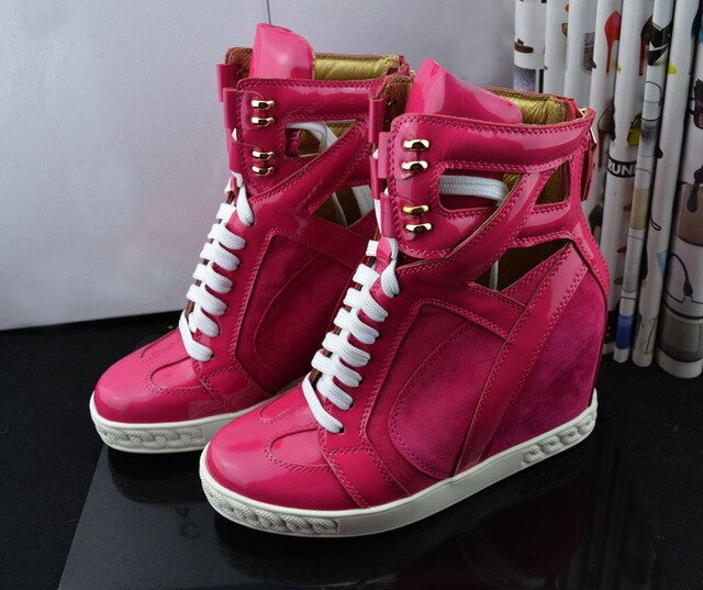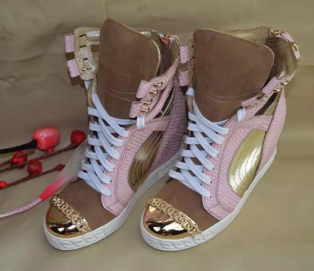 Patchwork Height Increasining Women Casual Shoes Wedges Sneakers Genuine Leather Metal Toe Pink Lace Up Platform Shoes Women