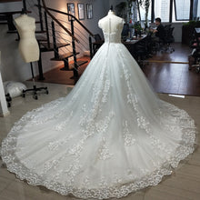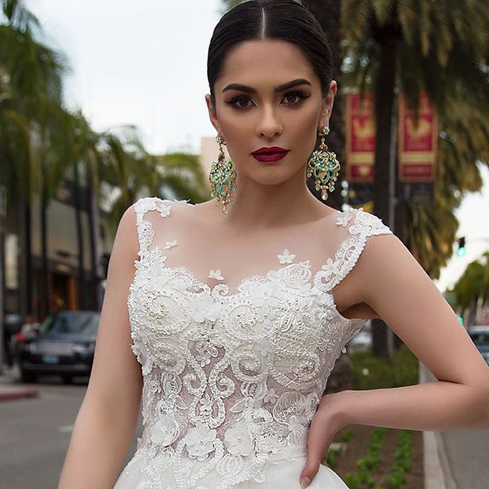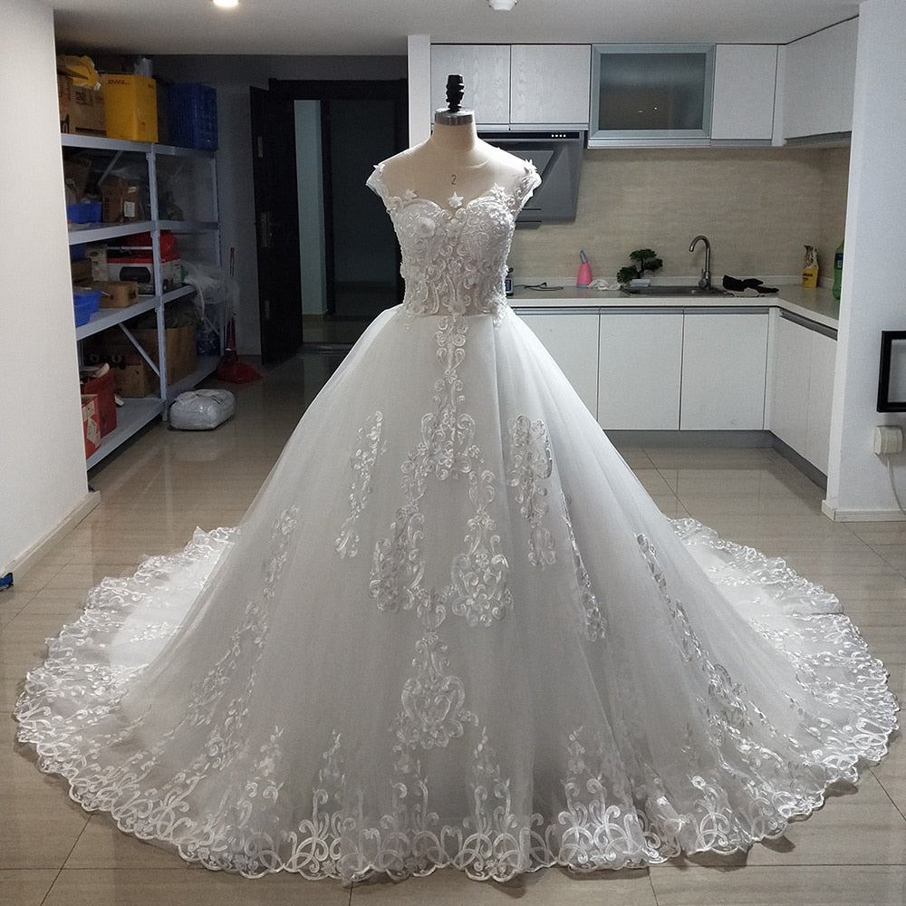 Pearls Appliques Flowers Gorgeous Ball Gown Wedding Dresses With Chapel Train Casamento See Through Sexy Bridal Dress Plus Size