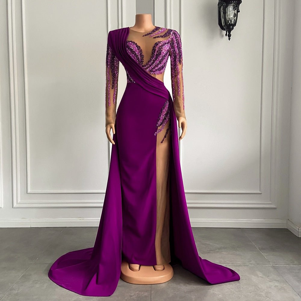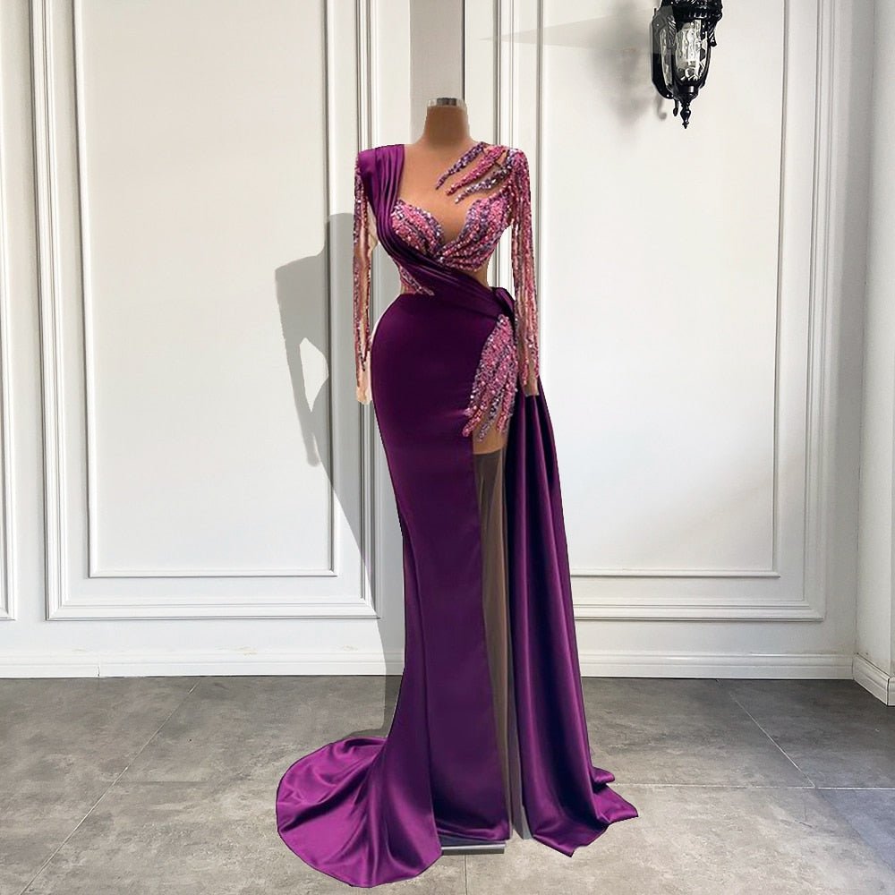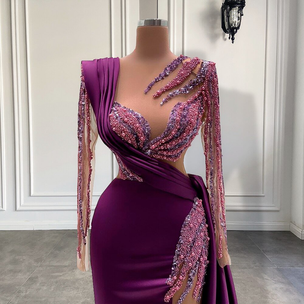 Pearls Dubai Women Purple Satin Sheer Formal Evening Gowns