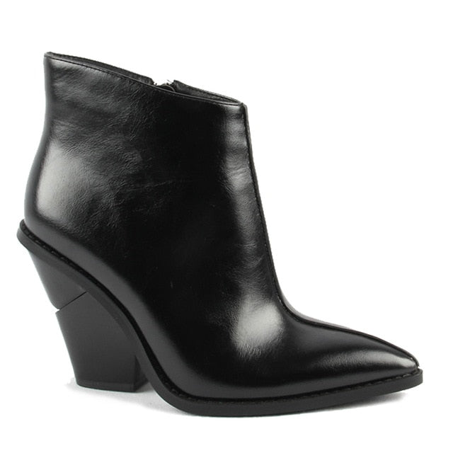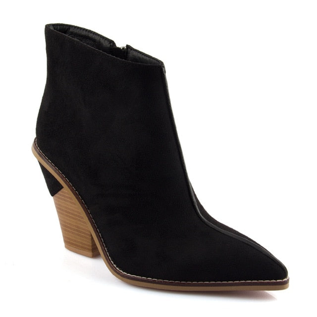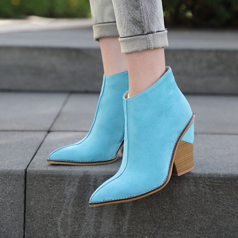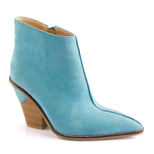 Women Thick High Heels Pointed Toe Western Cowboy Boots Female Black Blue Leather Shoes for Lady 2020