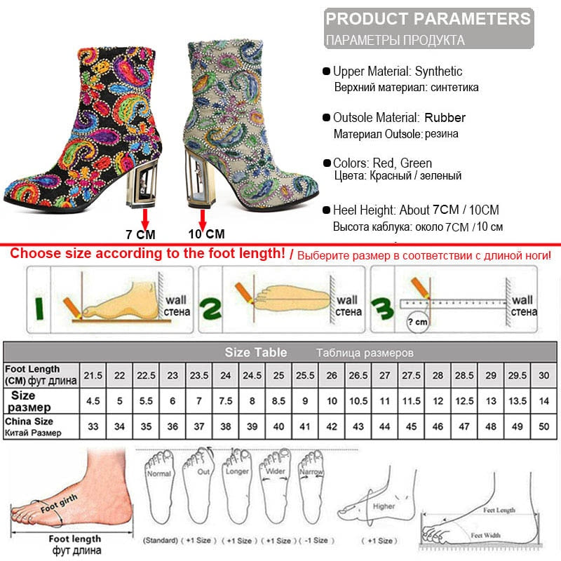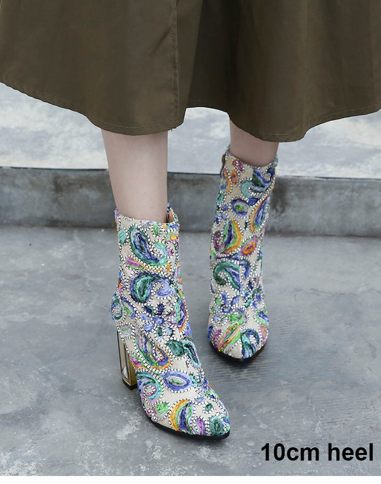 ethnic print flower women's boots mixed color crystal bird cage high heels 10cm high quality female short boots