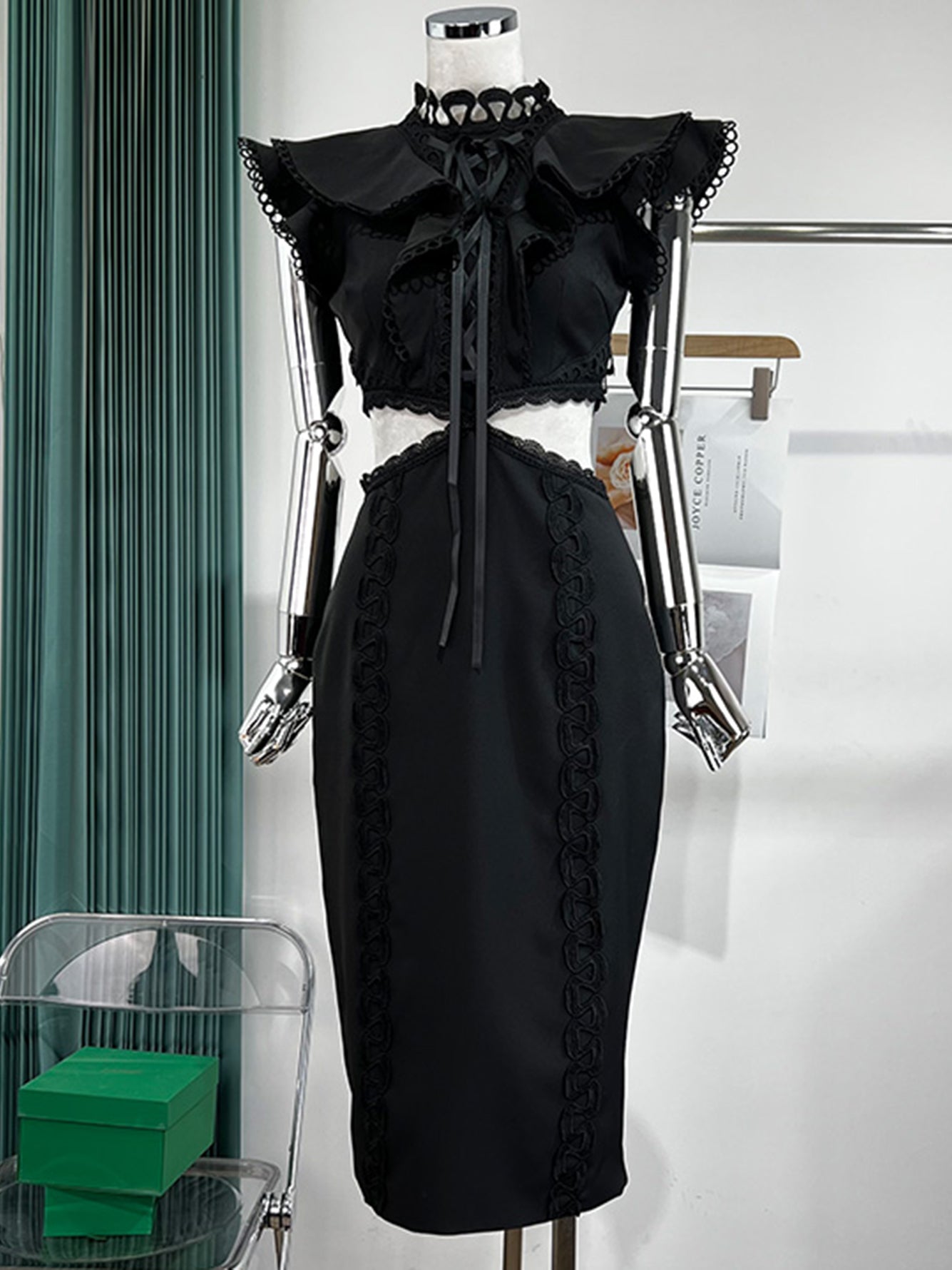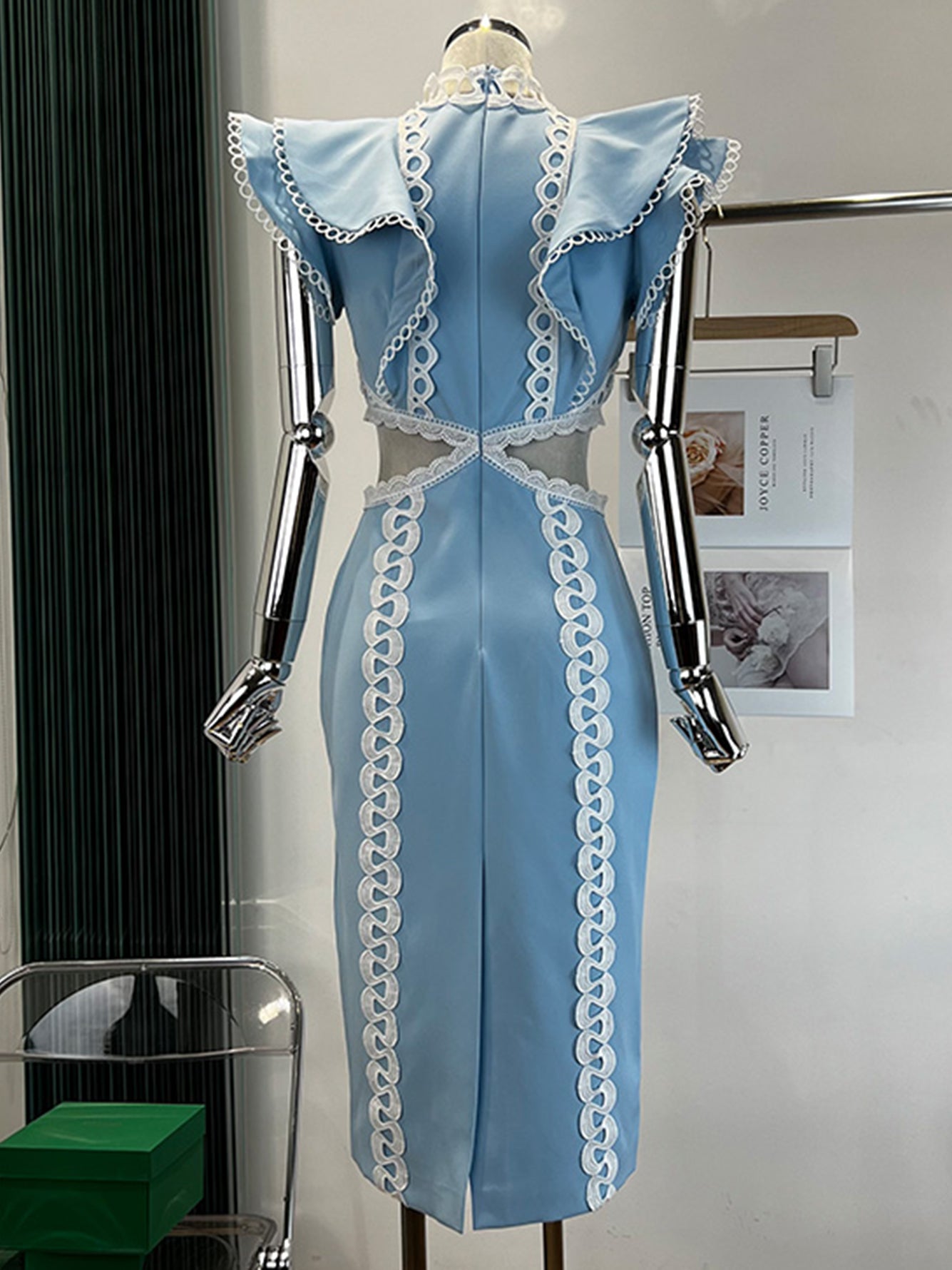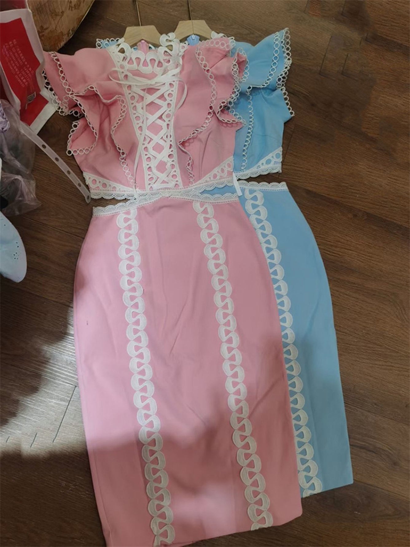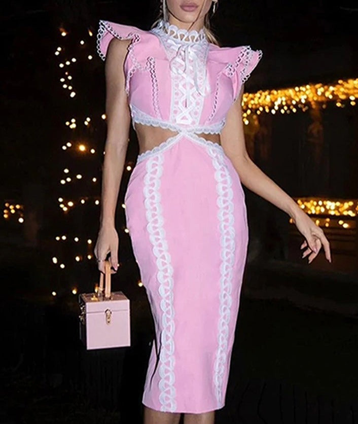 Pink Dress Women Sexy Hollow Out Lace Ruffle Bodycon Midi