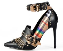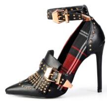 Women's Pumps High Tartan Heels Plaid Dress Shoes with Rivets Ankle Strap Buckle Women Shoes