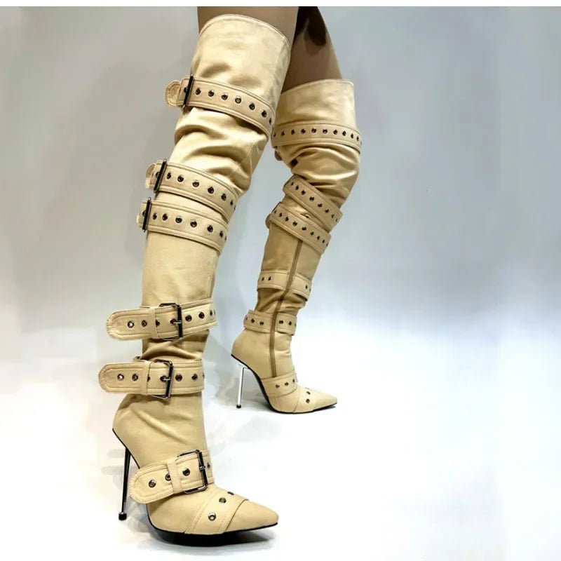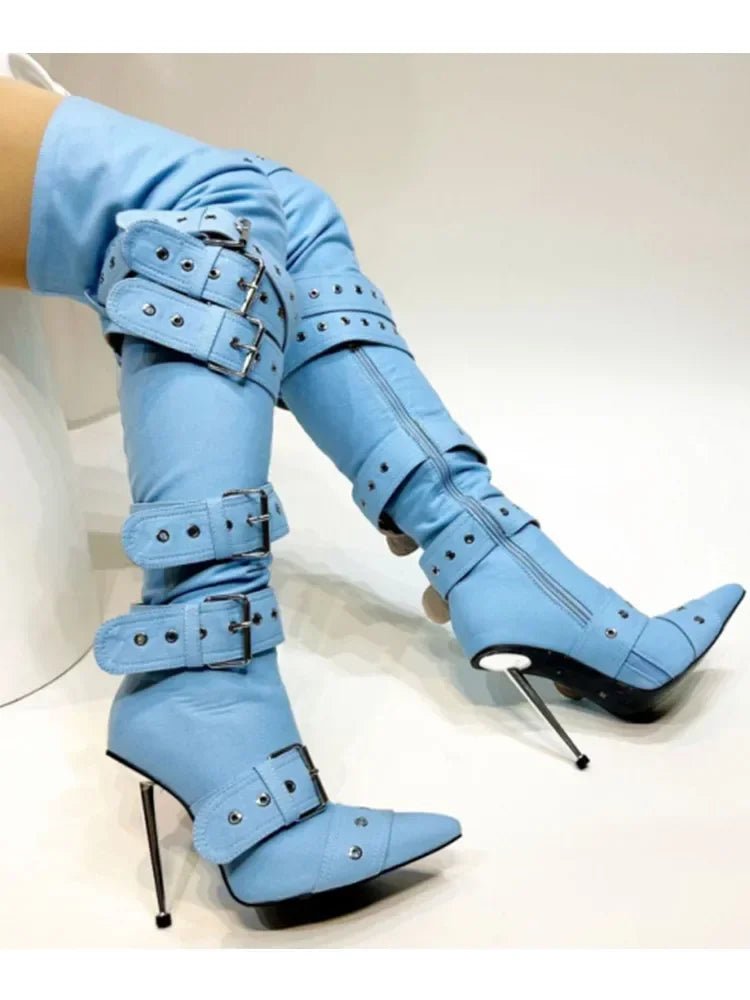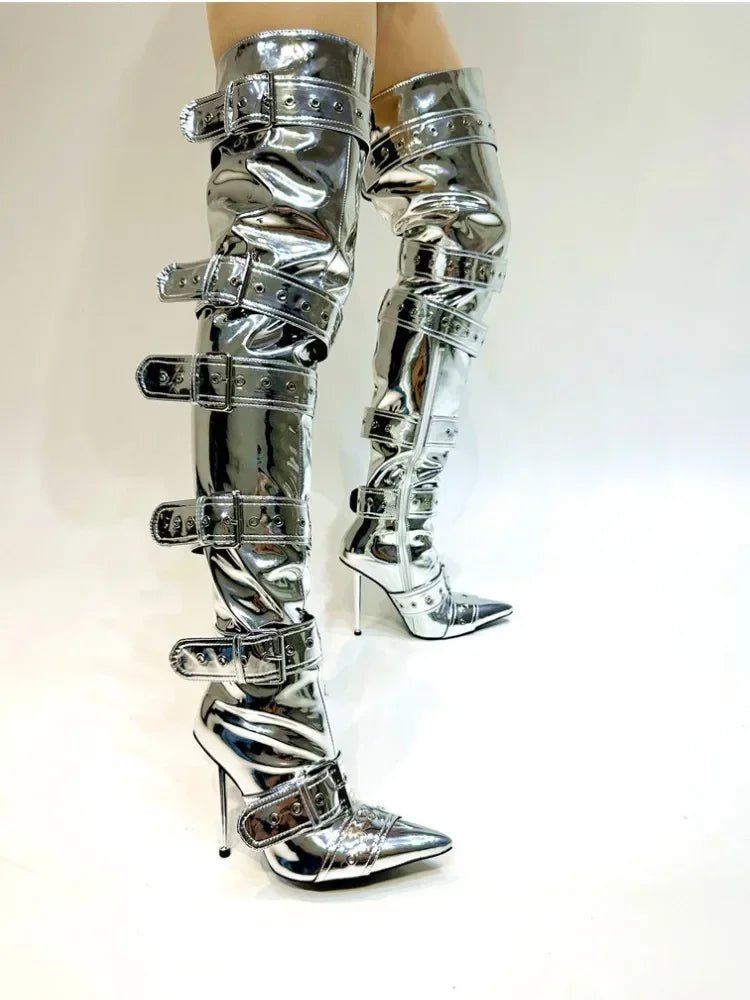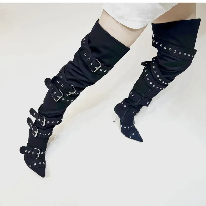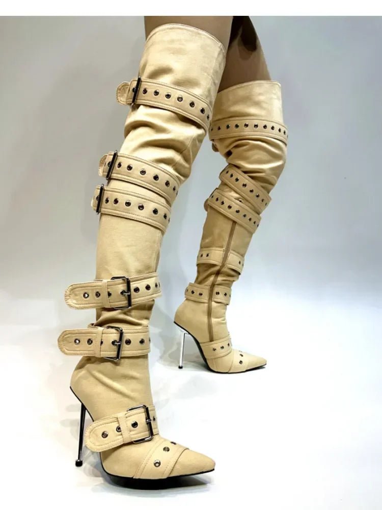 Pointed Buckle with Rivet Thin High Heel Over Knee Boots Sexy Women's 43 Large Boots