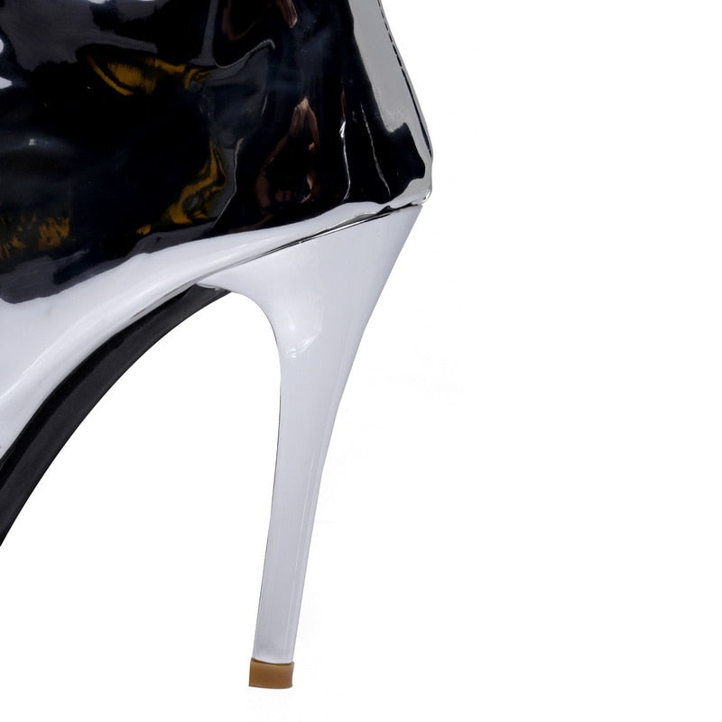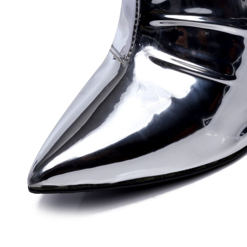 Stylish Girl silver mirror leather pointed toe high heel over the knee boots shiny sexy tall booties