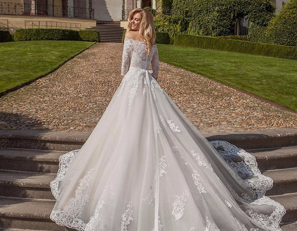 Princess A-line Wedding Dress Three Quarter Sleeve Brautkleid Boat Neck Lace Appliques Tulle Bridal Gowns