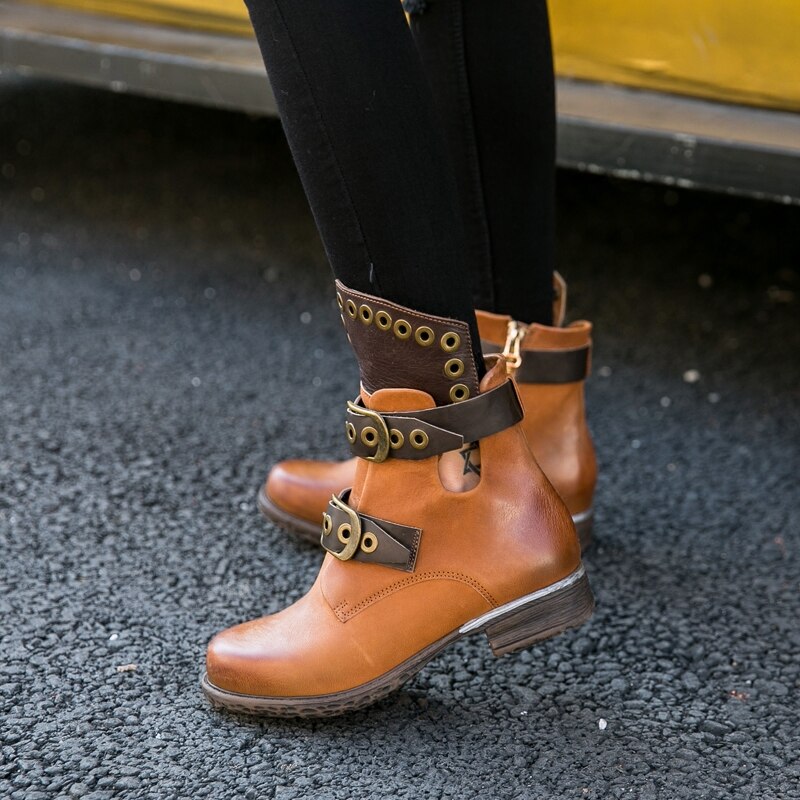 Fashion Mixed Color Women Short Boots Low Heel Hollow Shoes Metal Ring Belt Buckle Chealsea Boots Zapatos Mujer