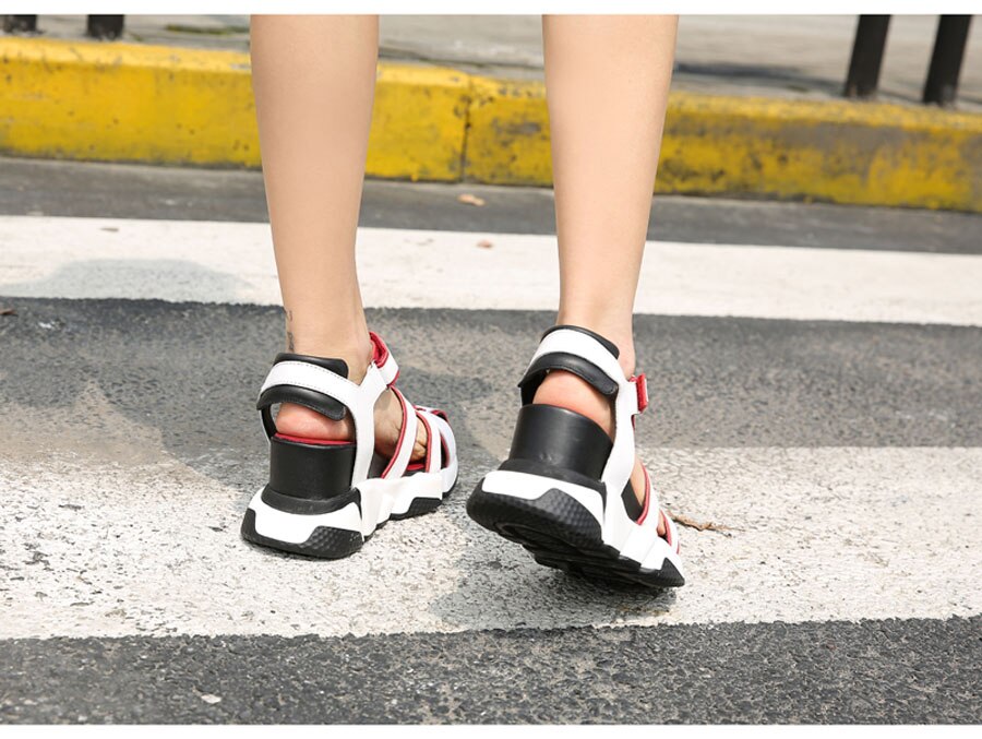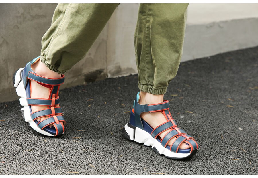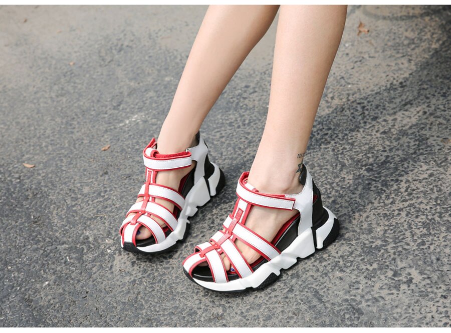 Genuine Leather Casual Sandals Women New Mixed Color Narrow Band Hollow Out Wedge Heels Sneakers Summer Shoes