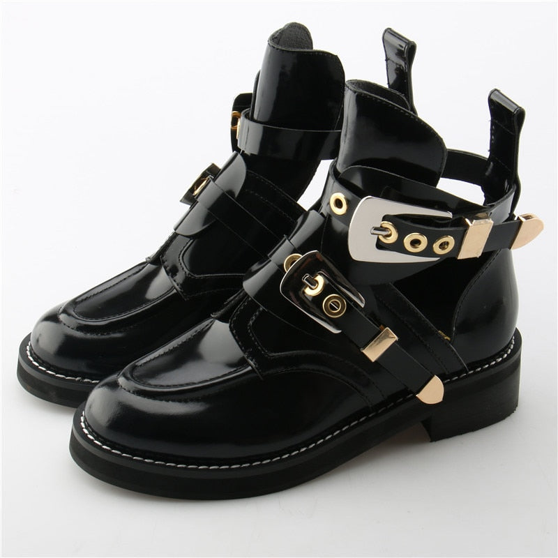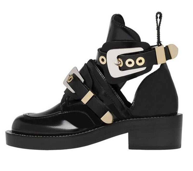 Punk Booties Buckle Straps Thick Heel Black Ankle Boots Cut Out Woman Boots Motorcycle Brand Designers Round Toe Summer Shoes