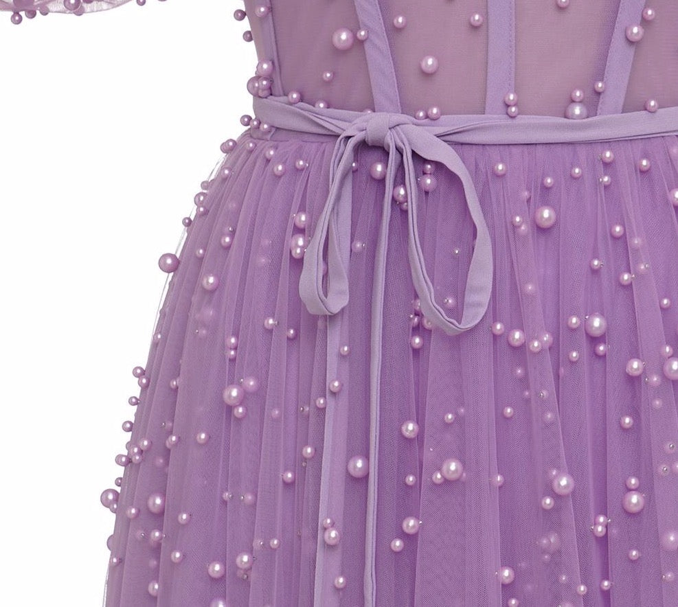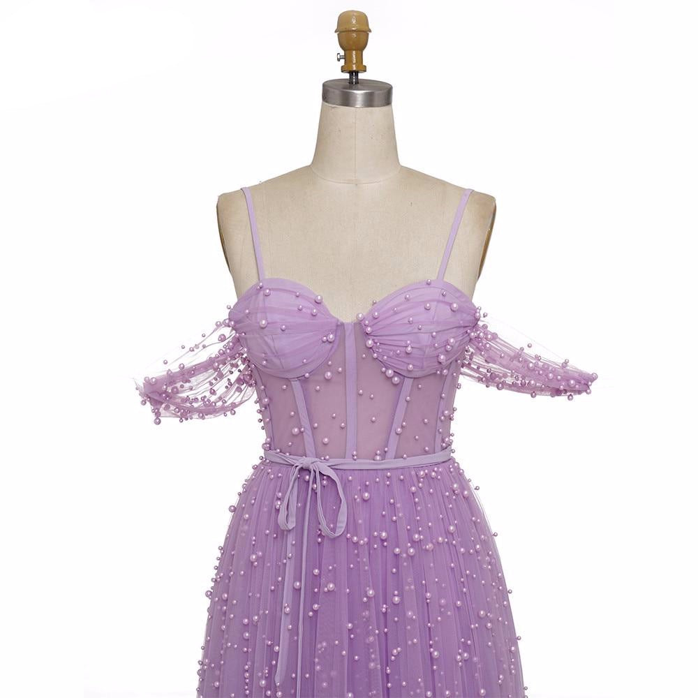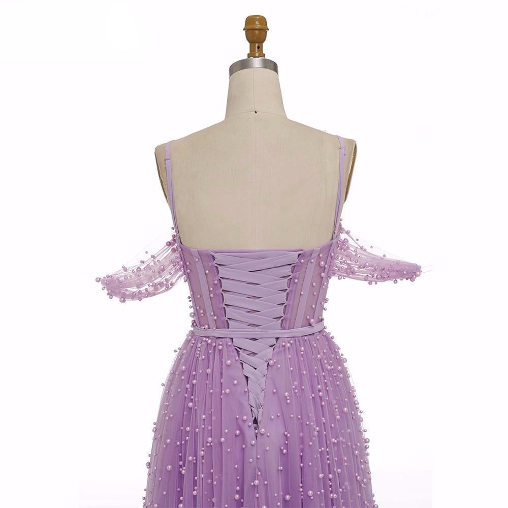 Purple Pearls Evening Dress Formal Dresses Shor Sleeves Open Back Slit A line Prom Elegant Dress Gown Long Dress Evening