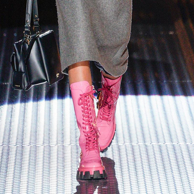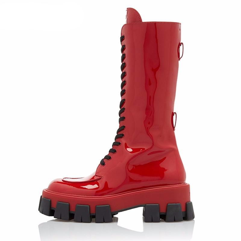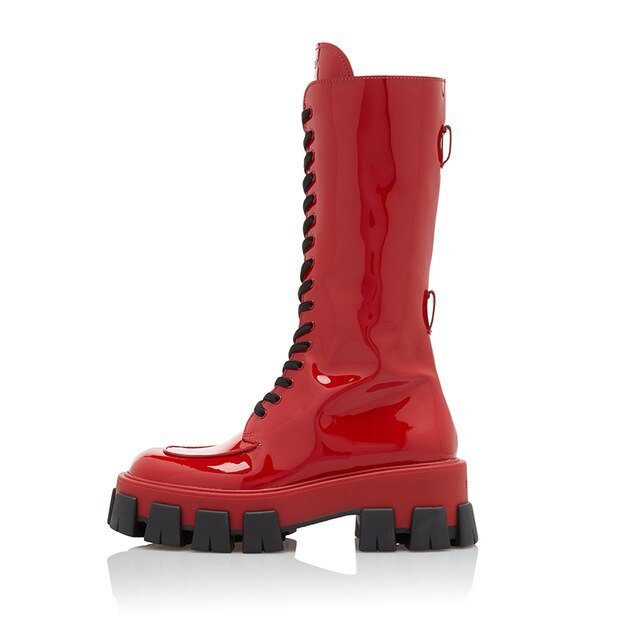 Red Pink Patent Leather Lady Rubber Boots Flat Platform Thick Sole