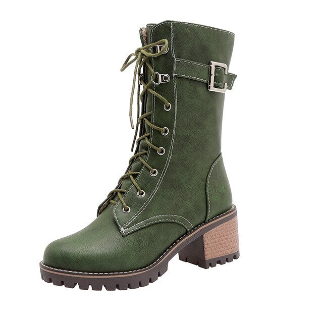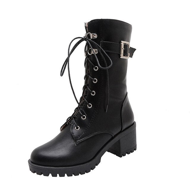 Winter Waterproof Pu Mid Calf Boots Women Fashion Buckle High-top Platform