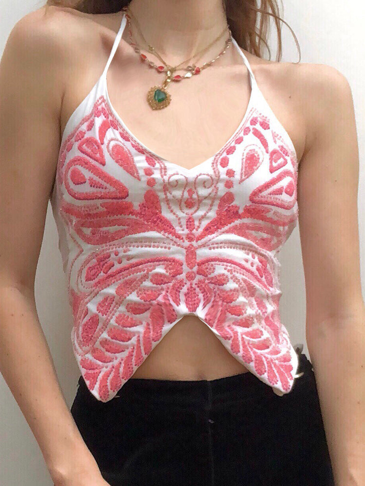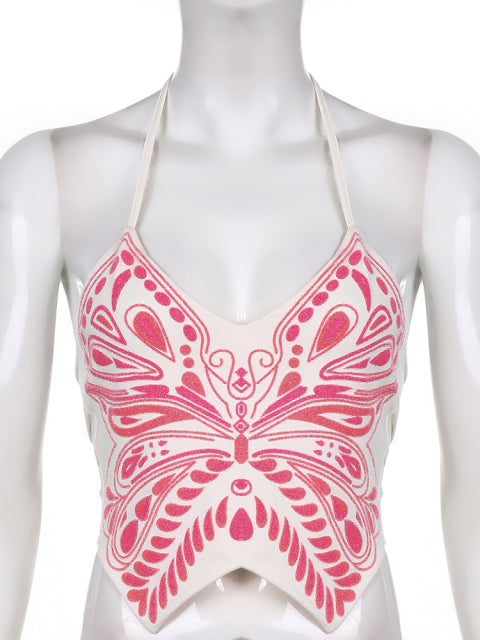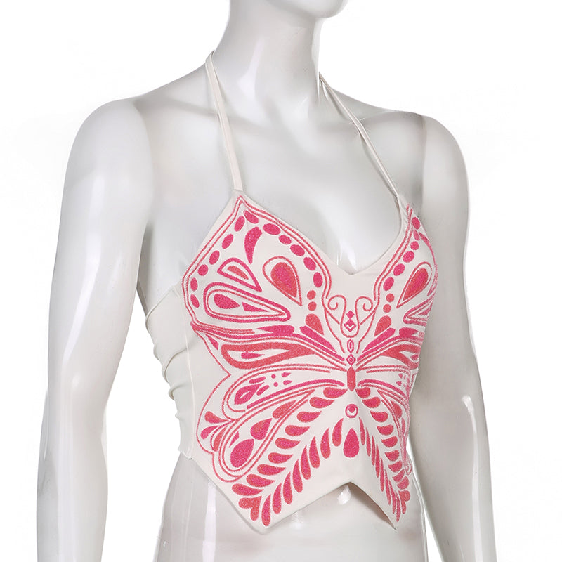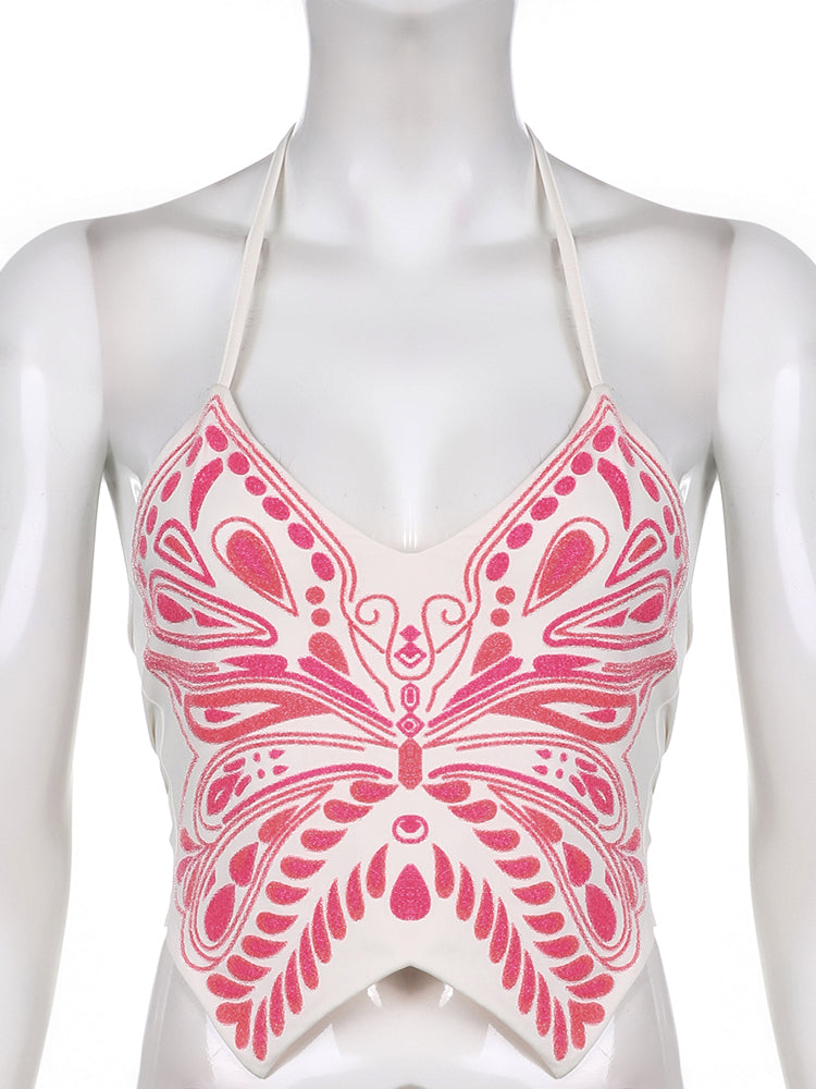Butterfly Print Halter Camisole Corset Woman Backless Crop Top