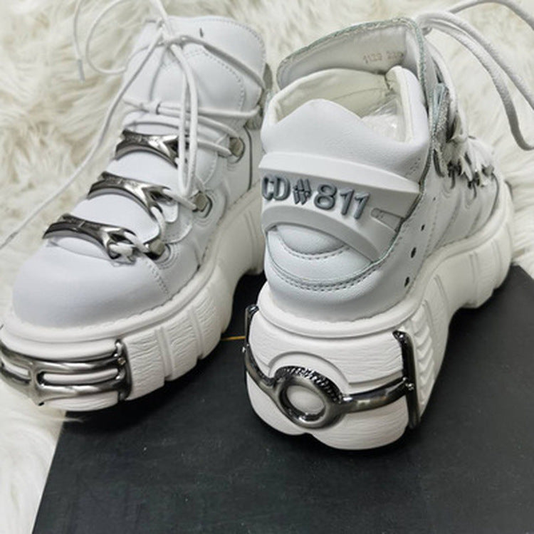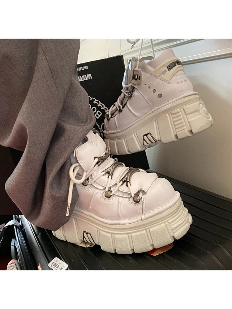Round Toe Heavy Metal Thick-soled High-top Shoes Women's Solid Color Rivet Lace-up Small Leather Shoes Dark Motorcycle Boots