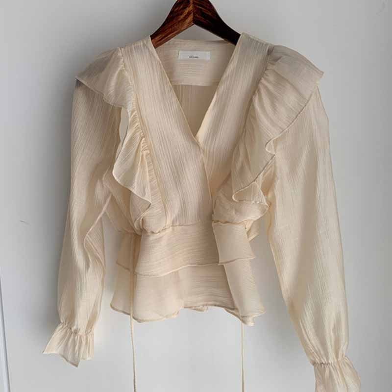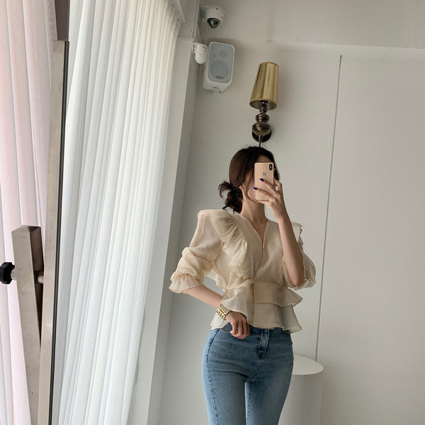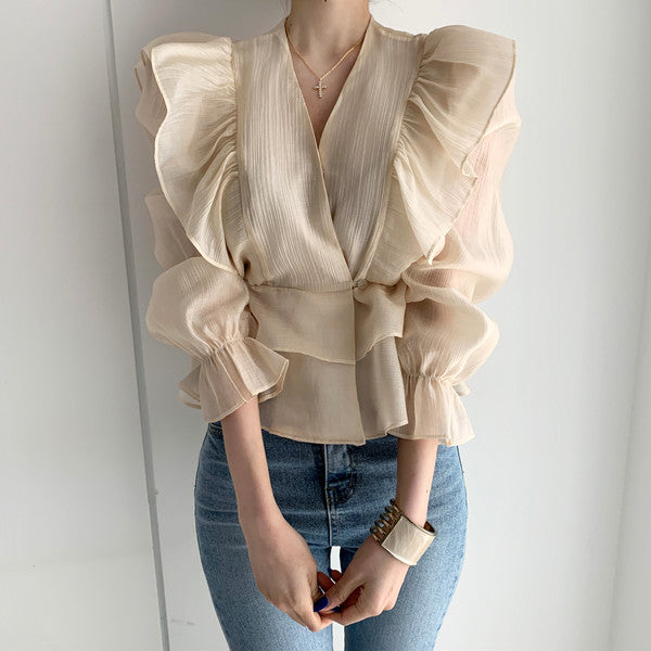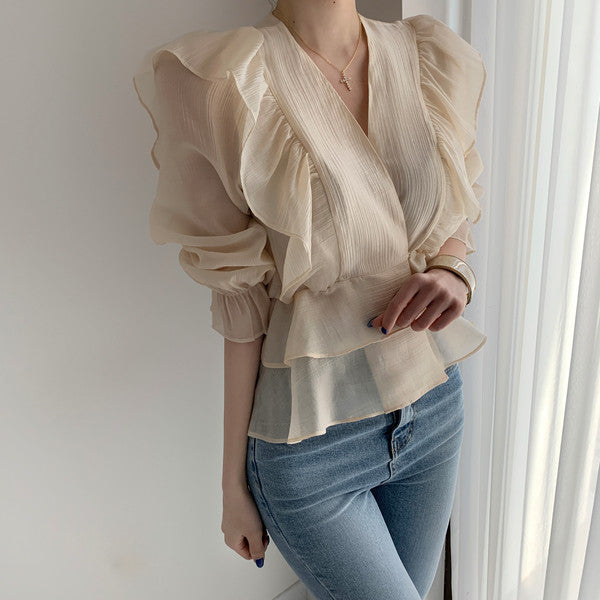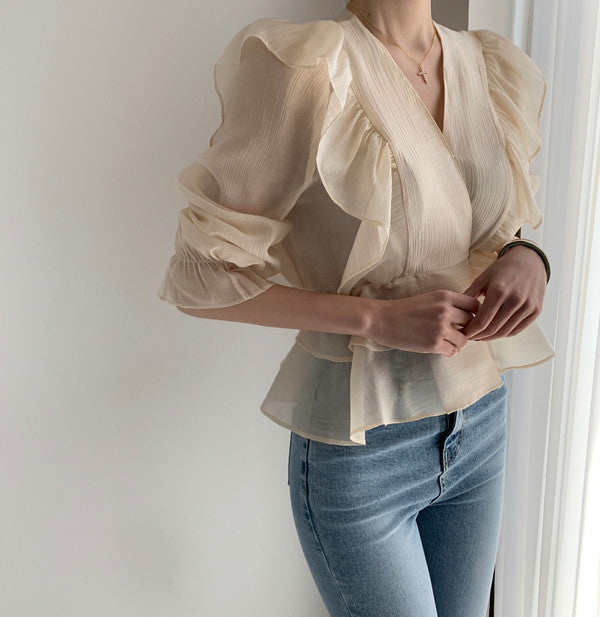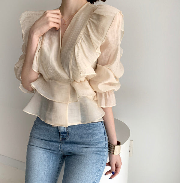 Ruffled Deep V-neck Silk Shirt Flare Sleeve