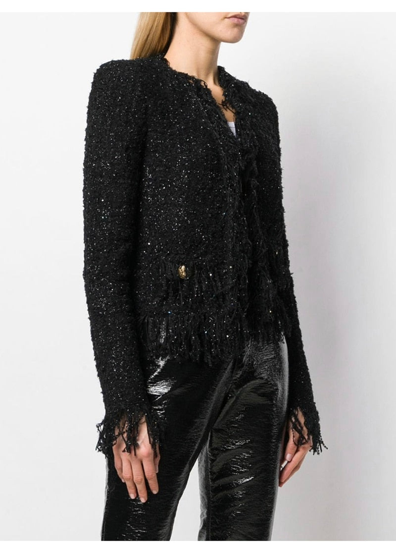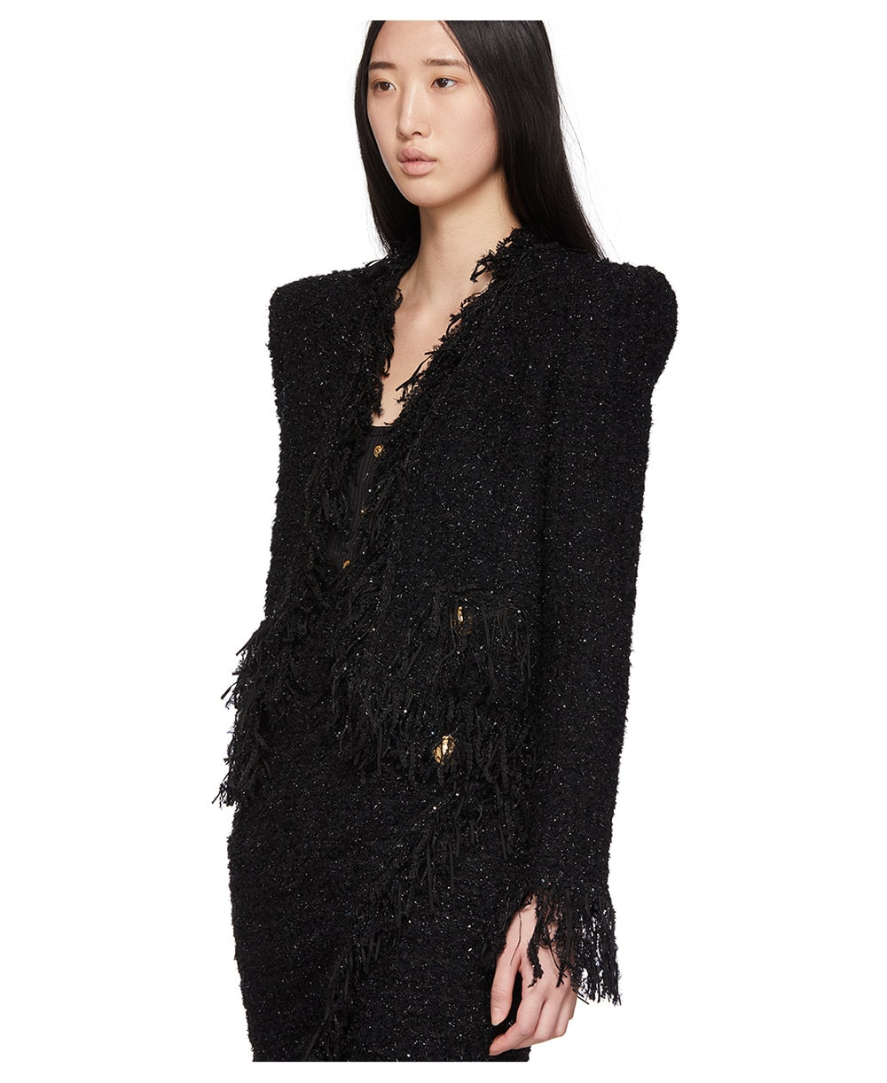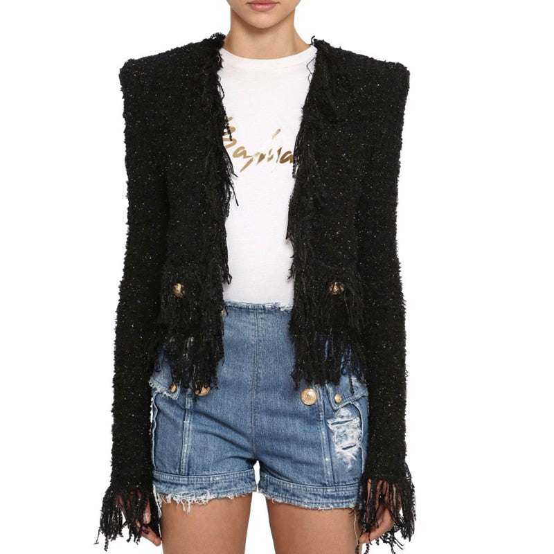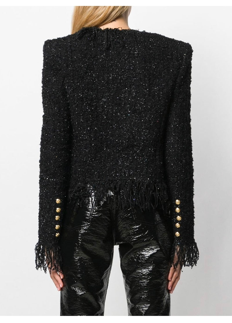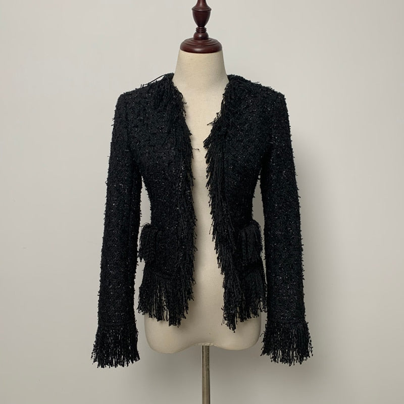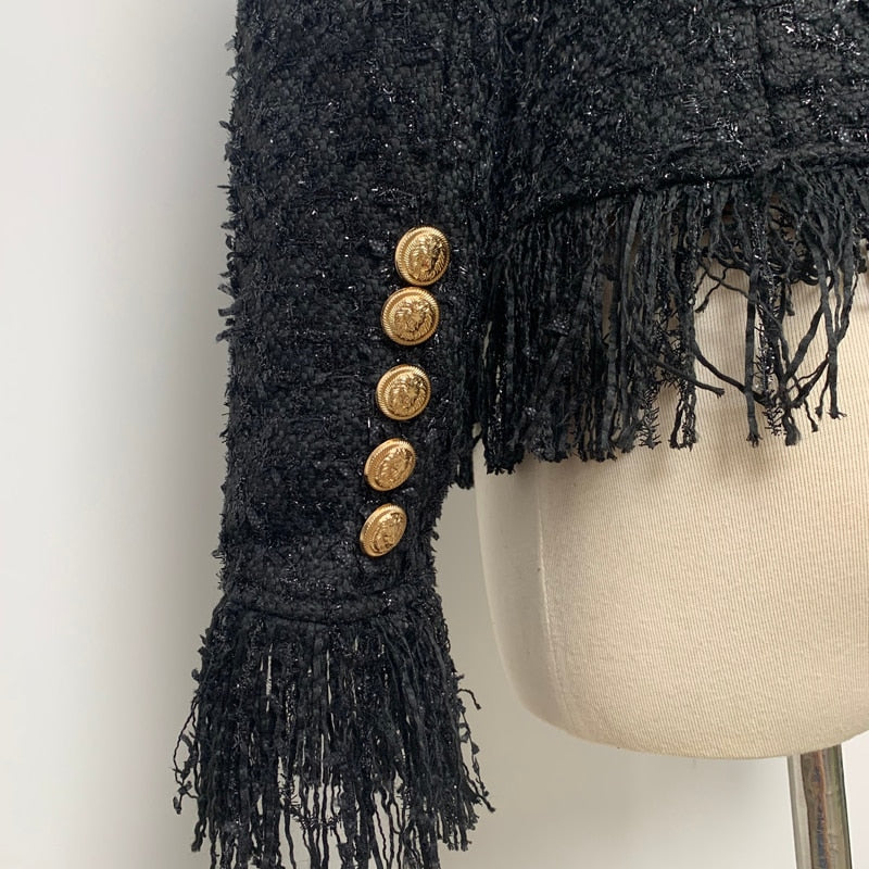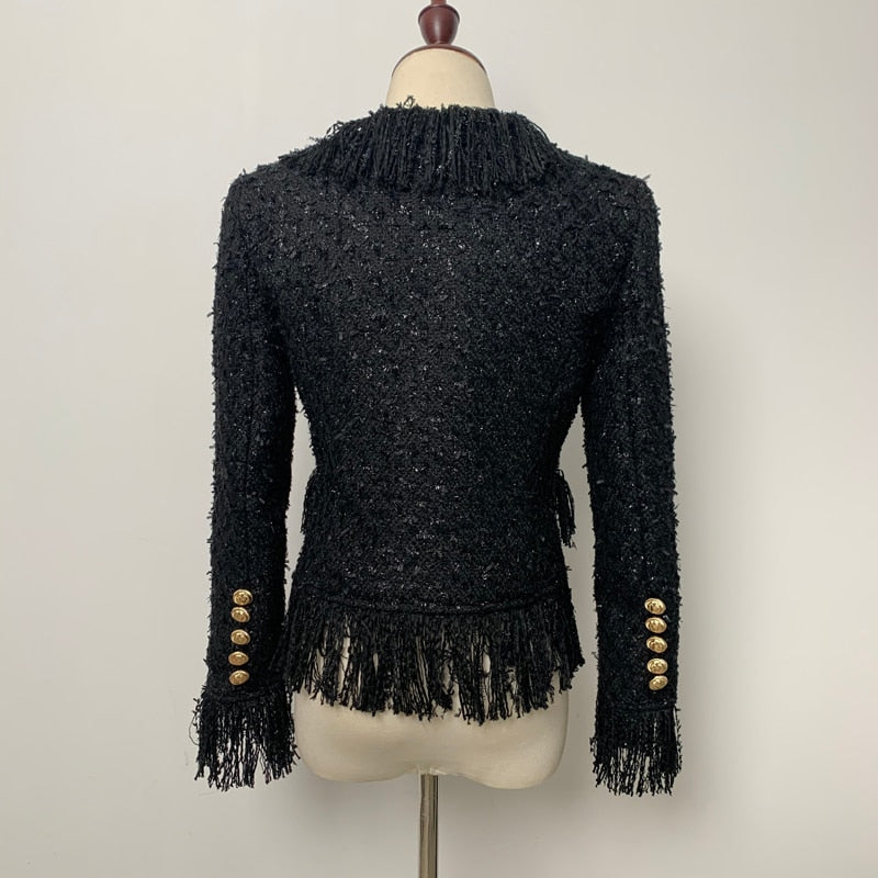Woolen Tassel Lace Pocket Metal Button Women Jacket Coat