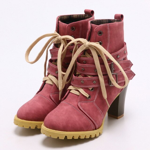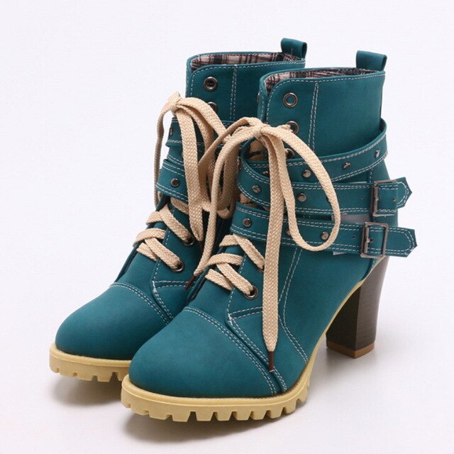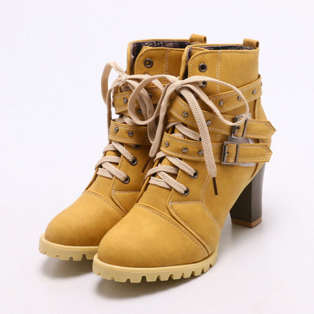 Women Boots Round Toe Belt Buckle Rivet Shoes Women Fashion High Thick