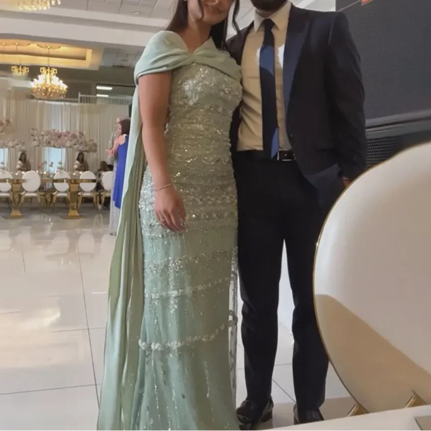 Saudi Arabic Sage Green Mermaid Beaded Evening Dress with Long Cape for Formal Occasion