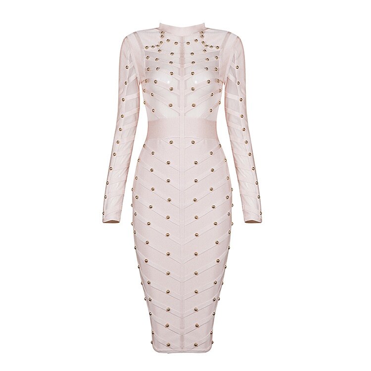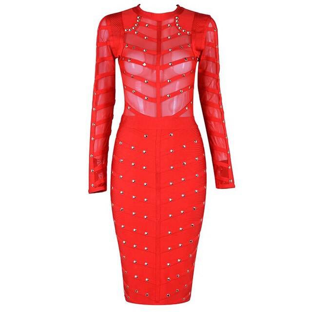 New Spring Celebrity Party Dress Women Knee Length Bodycon Dresses Sexy Mesh Long Sleeve Beaded Bandage Dresses