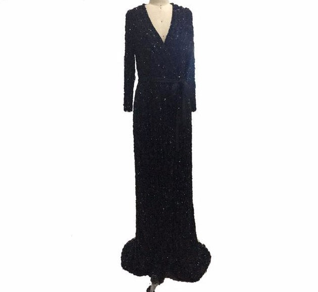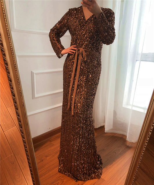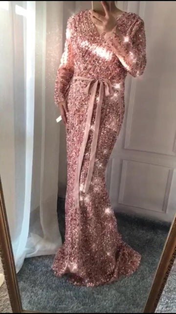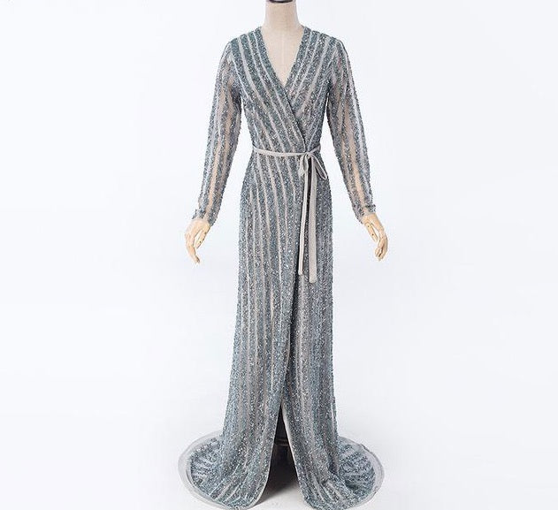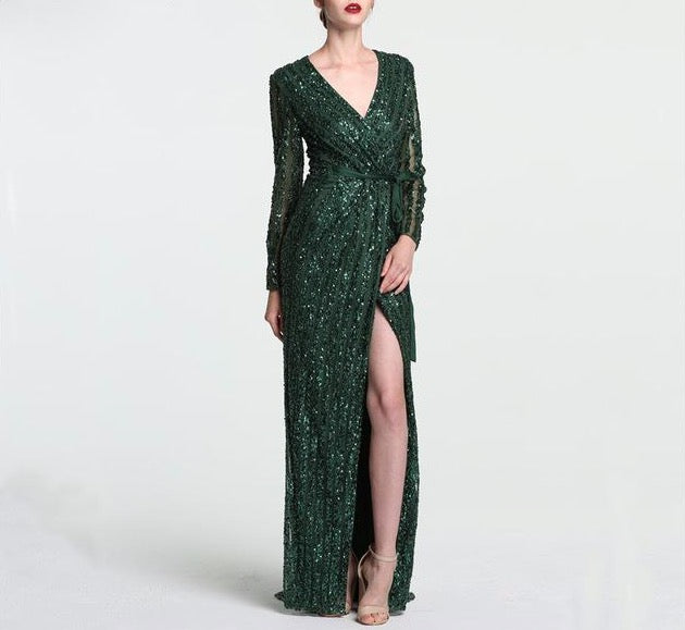 Fashion V-Neck Sleeping Style Green Evening Dress Beading Diamond Long Sleeves Formal Party Gown