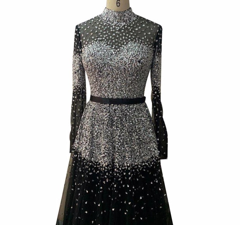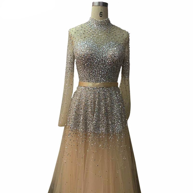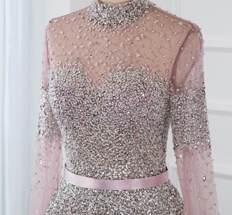 Latest Design Pink High Collar Evening Dress Long Sleeves Sequined Sexy Formal Party Gown
