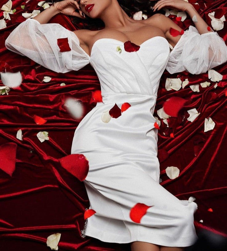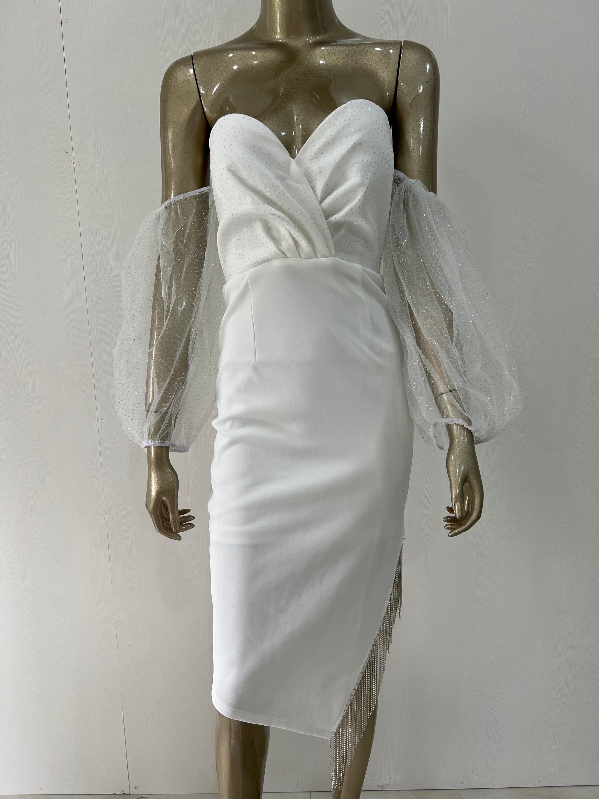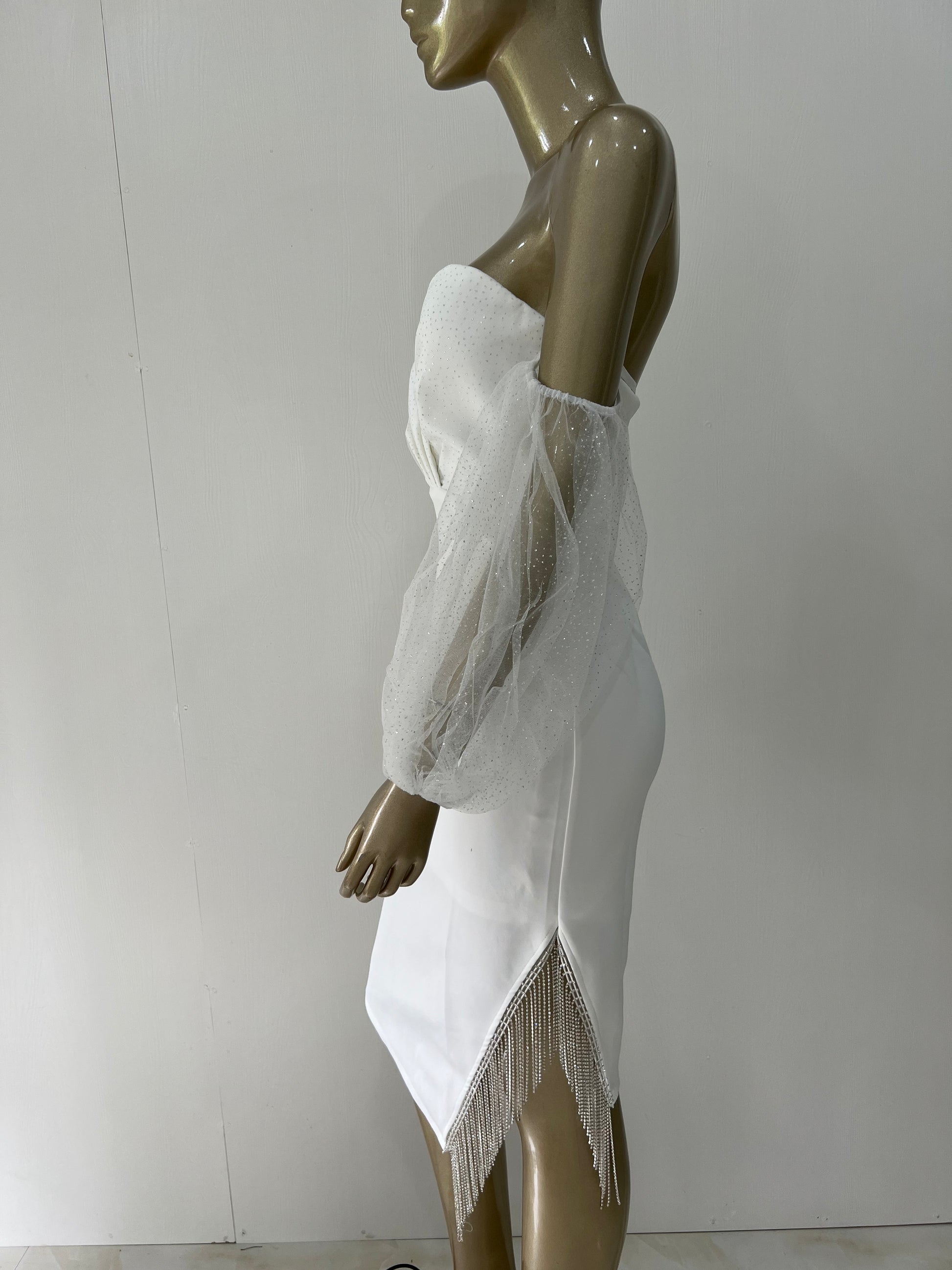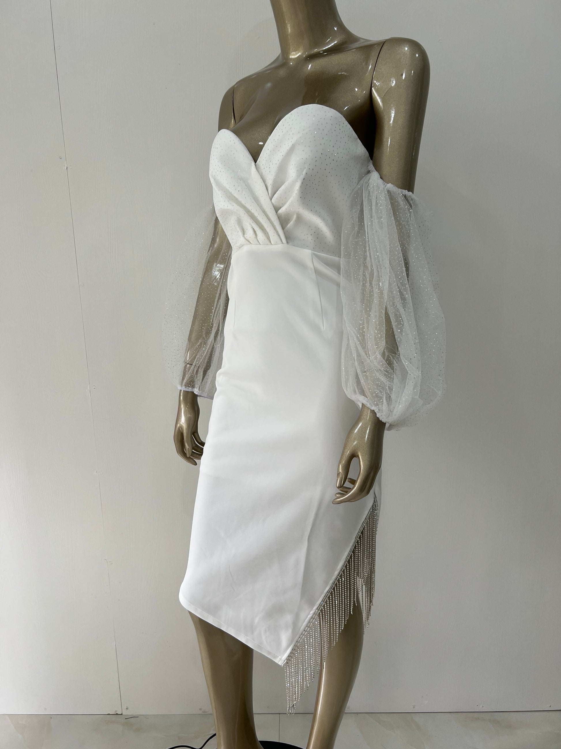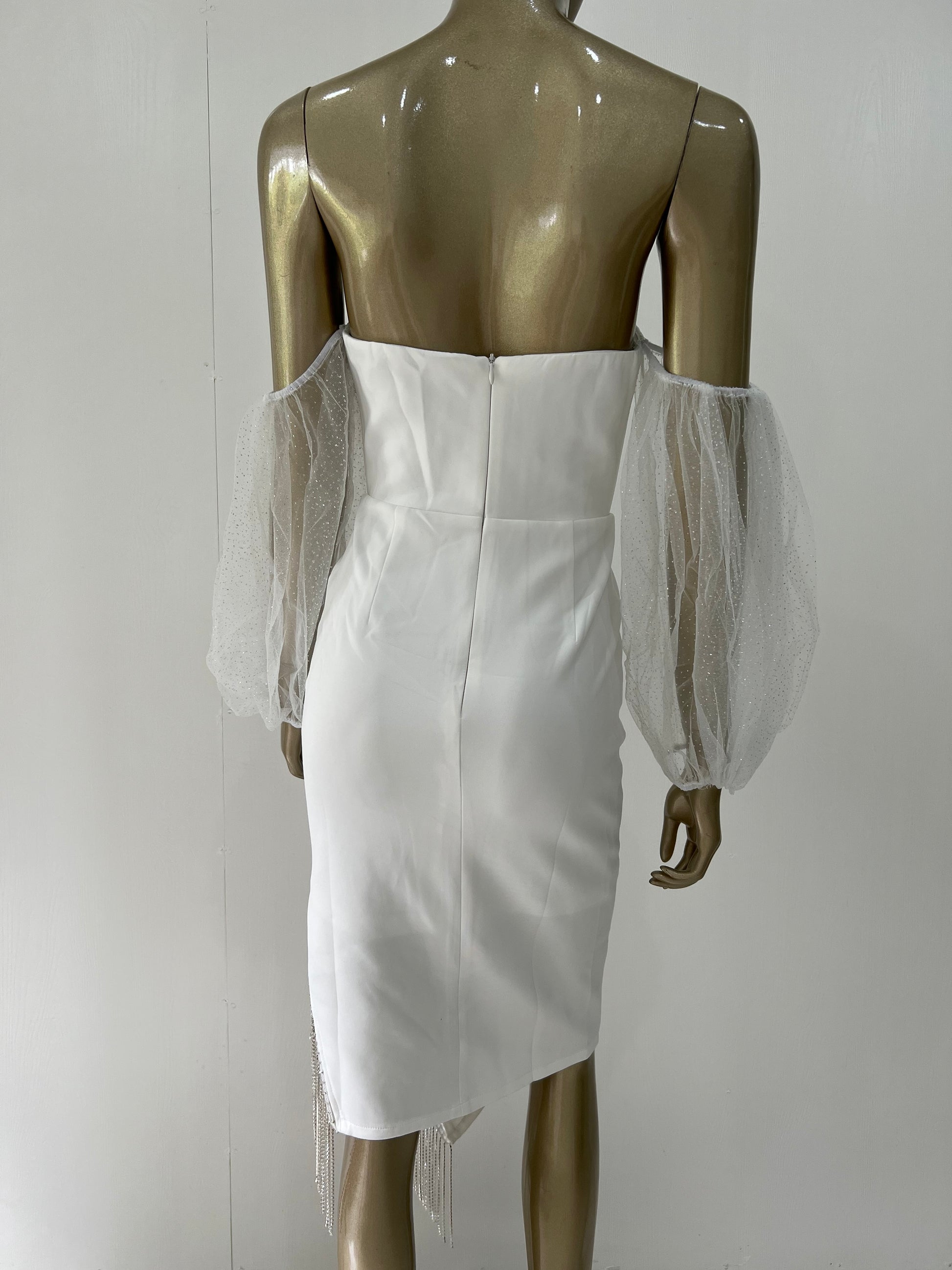 Sexy Off Shoulder Puff Sleeve Tassel Crystal White Midi Dress
